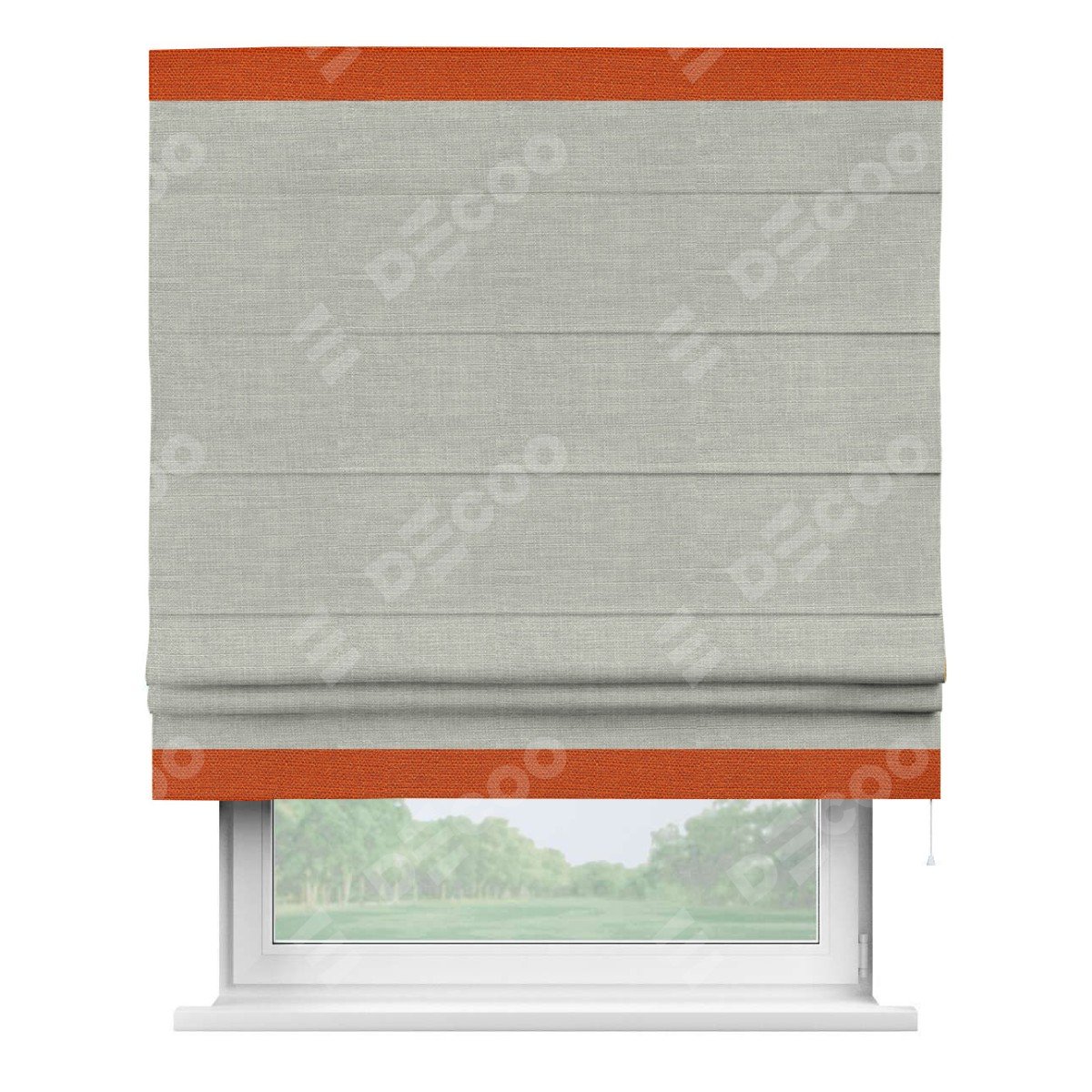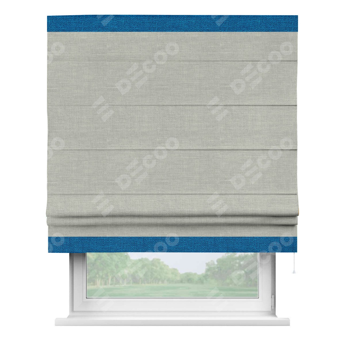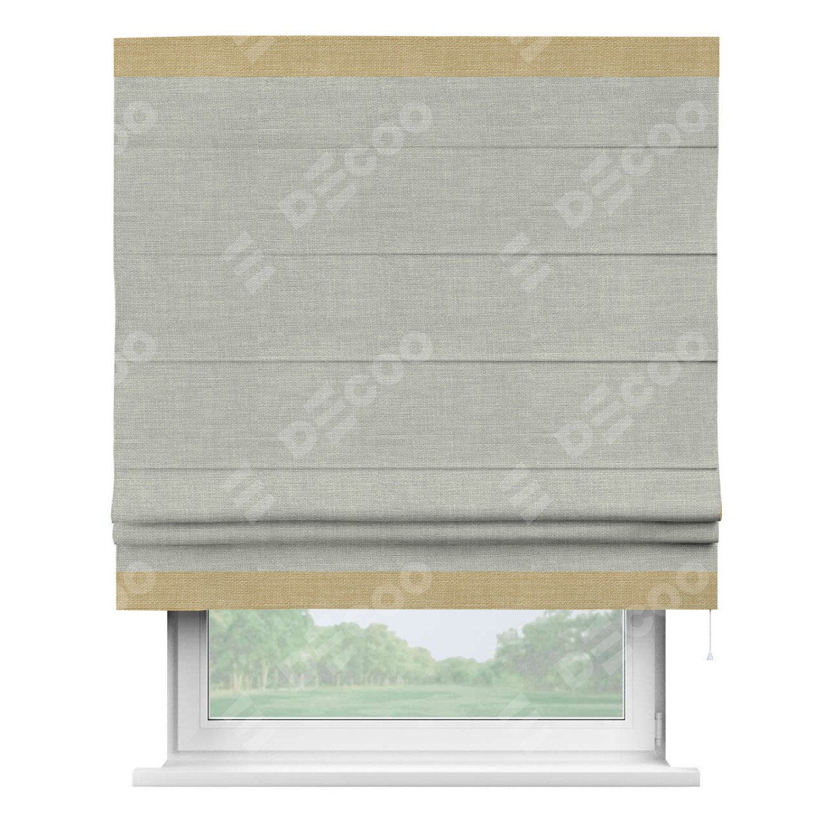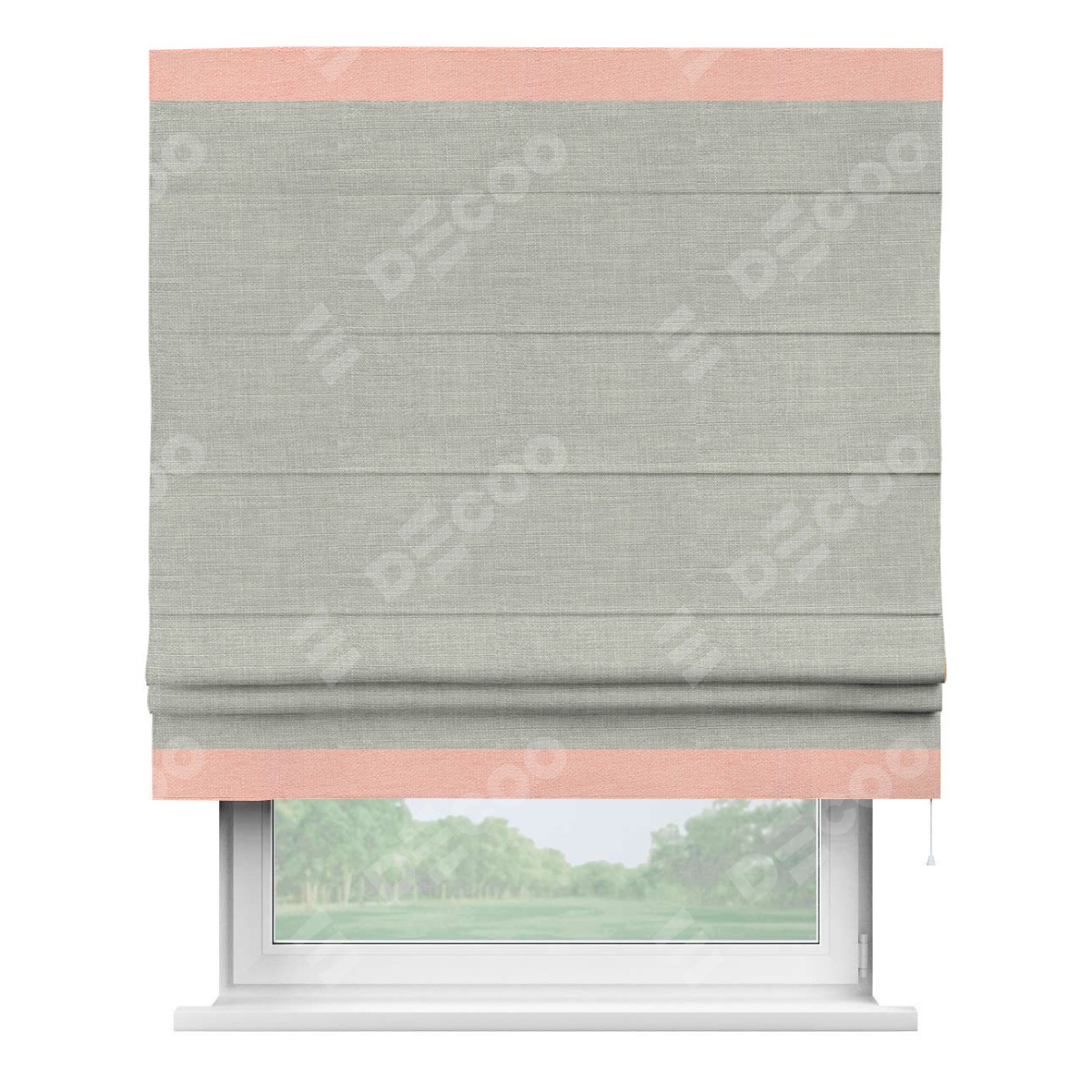 Римская штора производителя «Cortin», используется для проёма, пошита из ткани лён серый, артикул 7440. Отделка шторы кантом «Горизонт», ткань для канта используется из льна разной расцветки на выбор. Имеет универсальный механизм и подходит для монтажа: на потолок, на стену и в нишу.