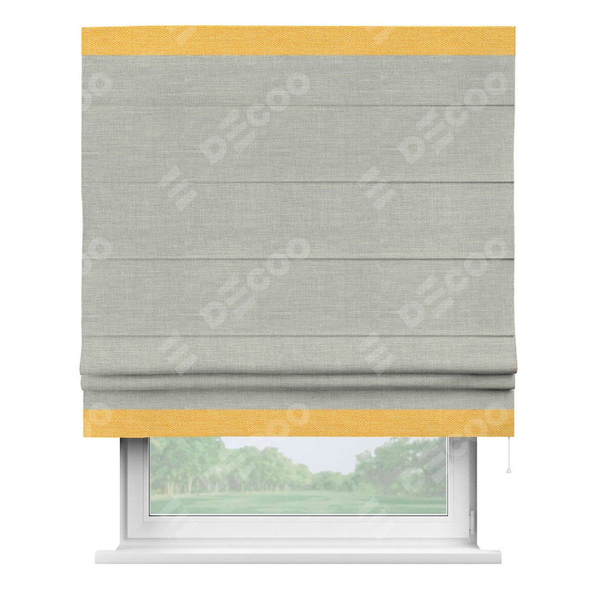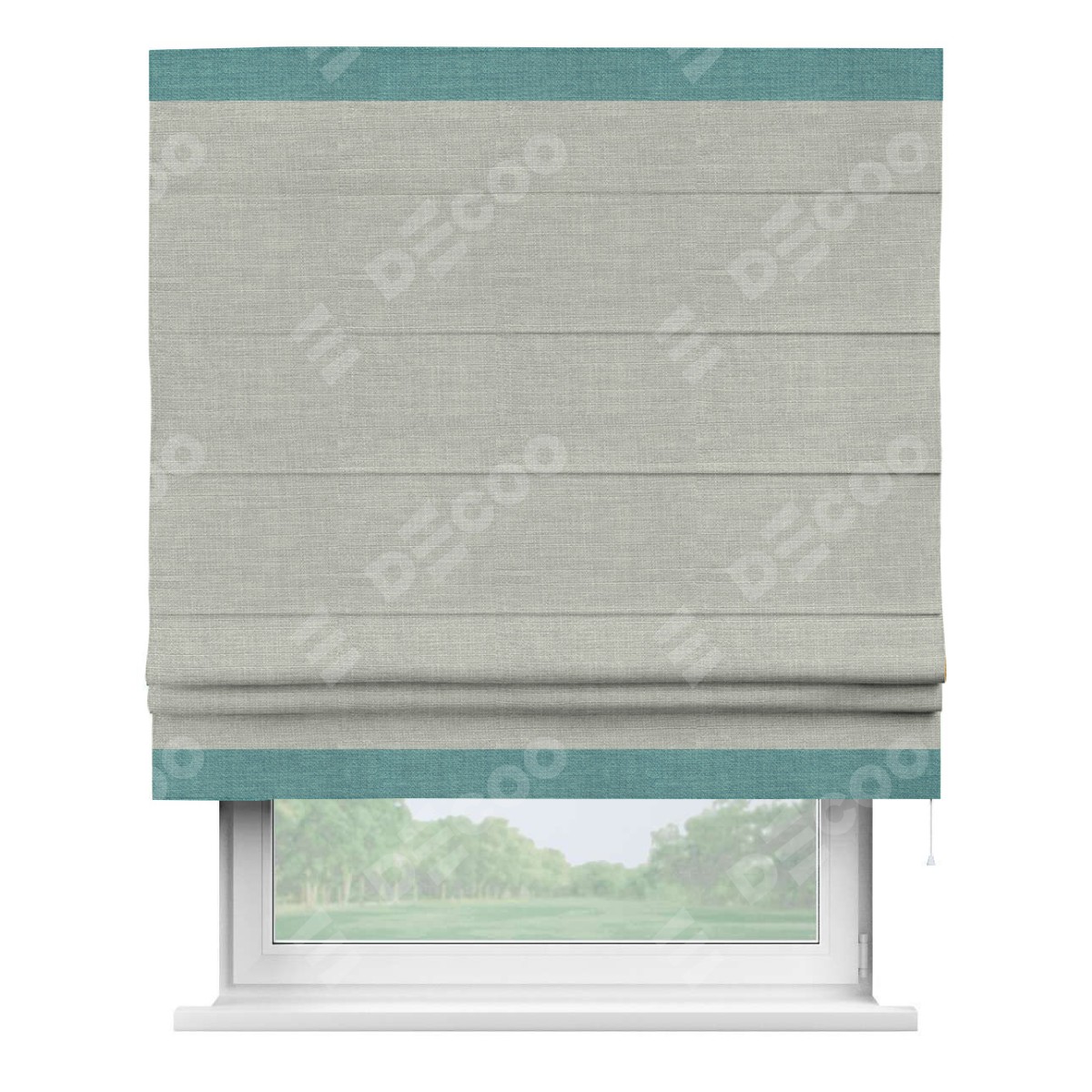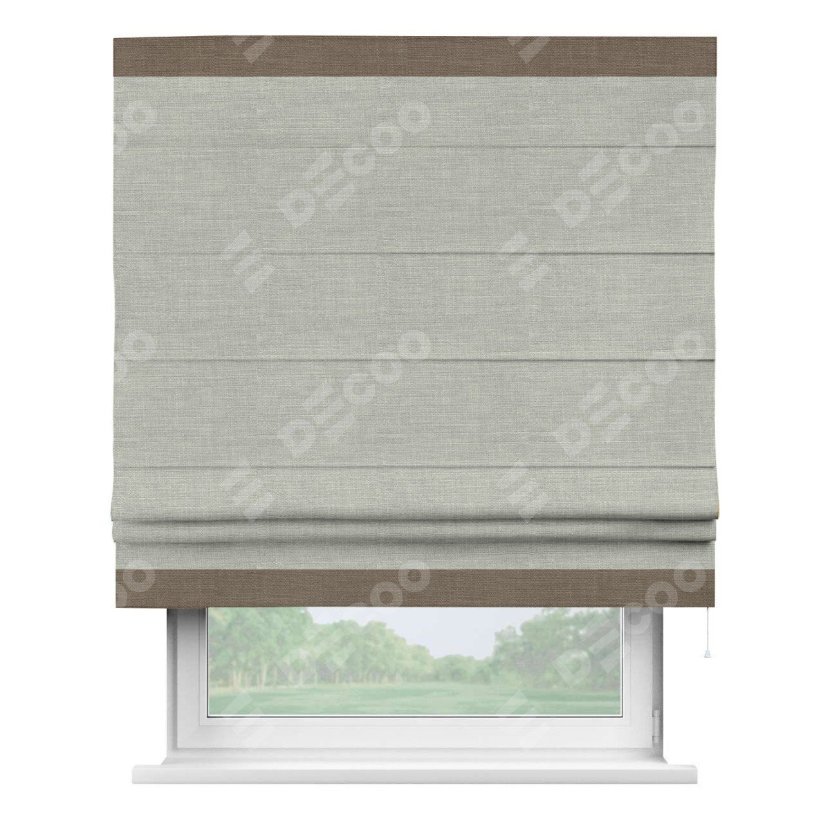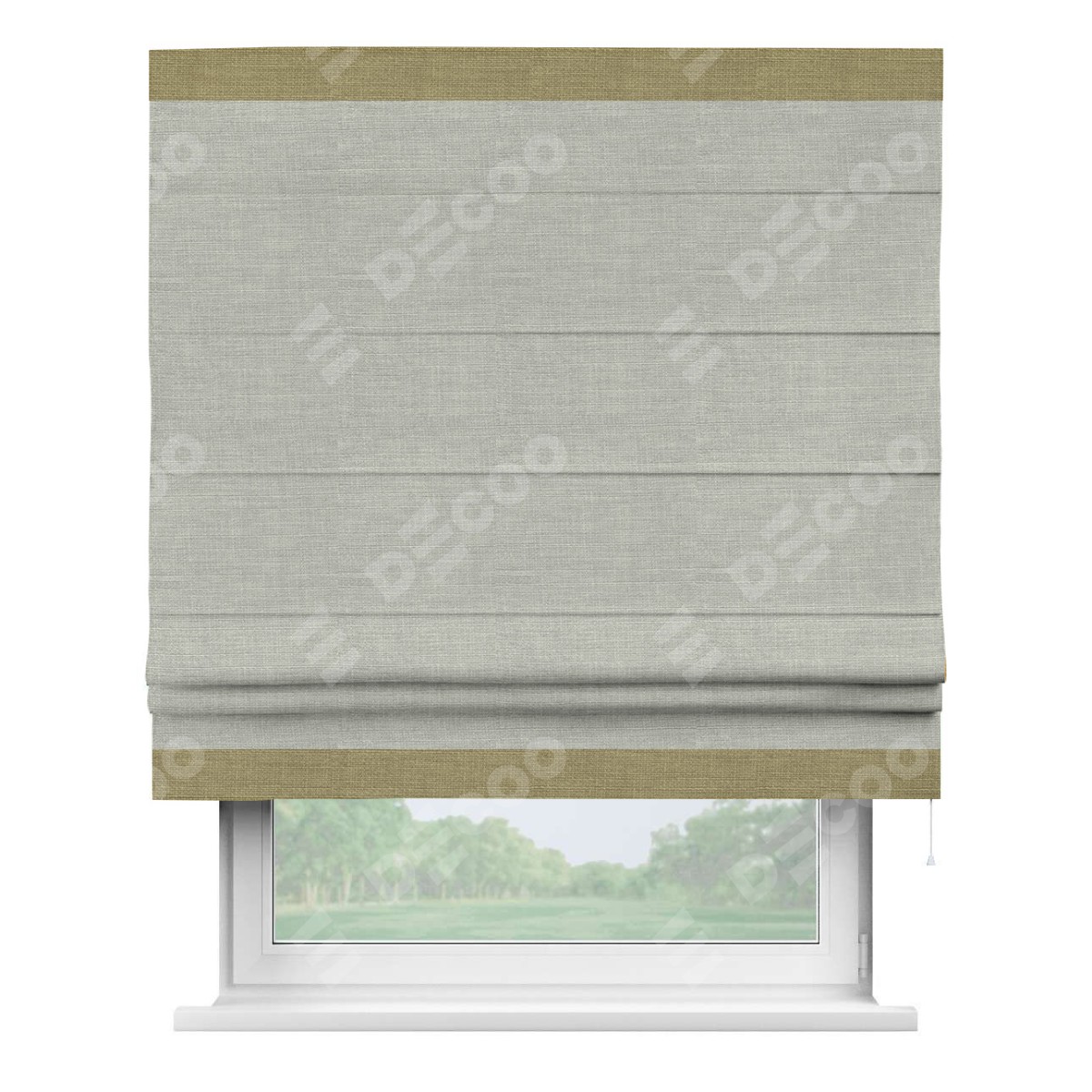 Римская штора производителя «Cortin», используется для проёма, пошита из ткани лён серый, артикул 7440. Отделка шторы кантом «Горизонт», ткань для канта используется из льна разной расцветки на выбор. Имеет универсальный механизм и подходит для монтажа: на потолок, на стену и в нишу.
