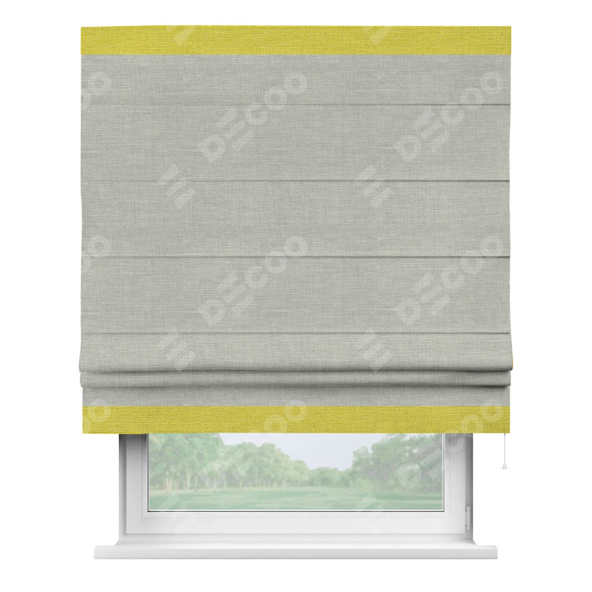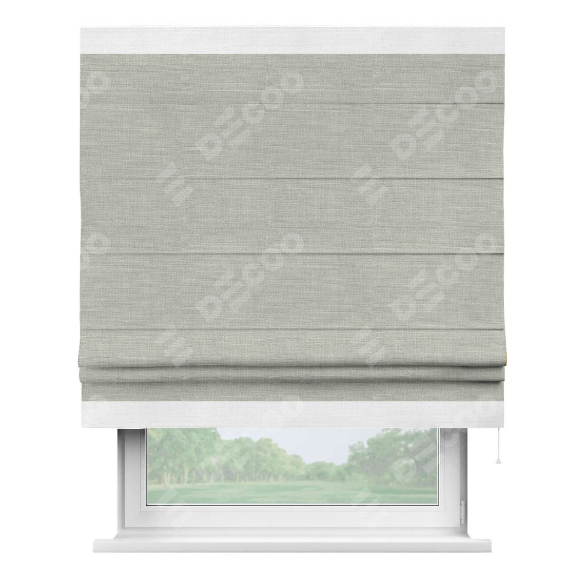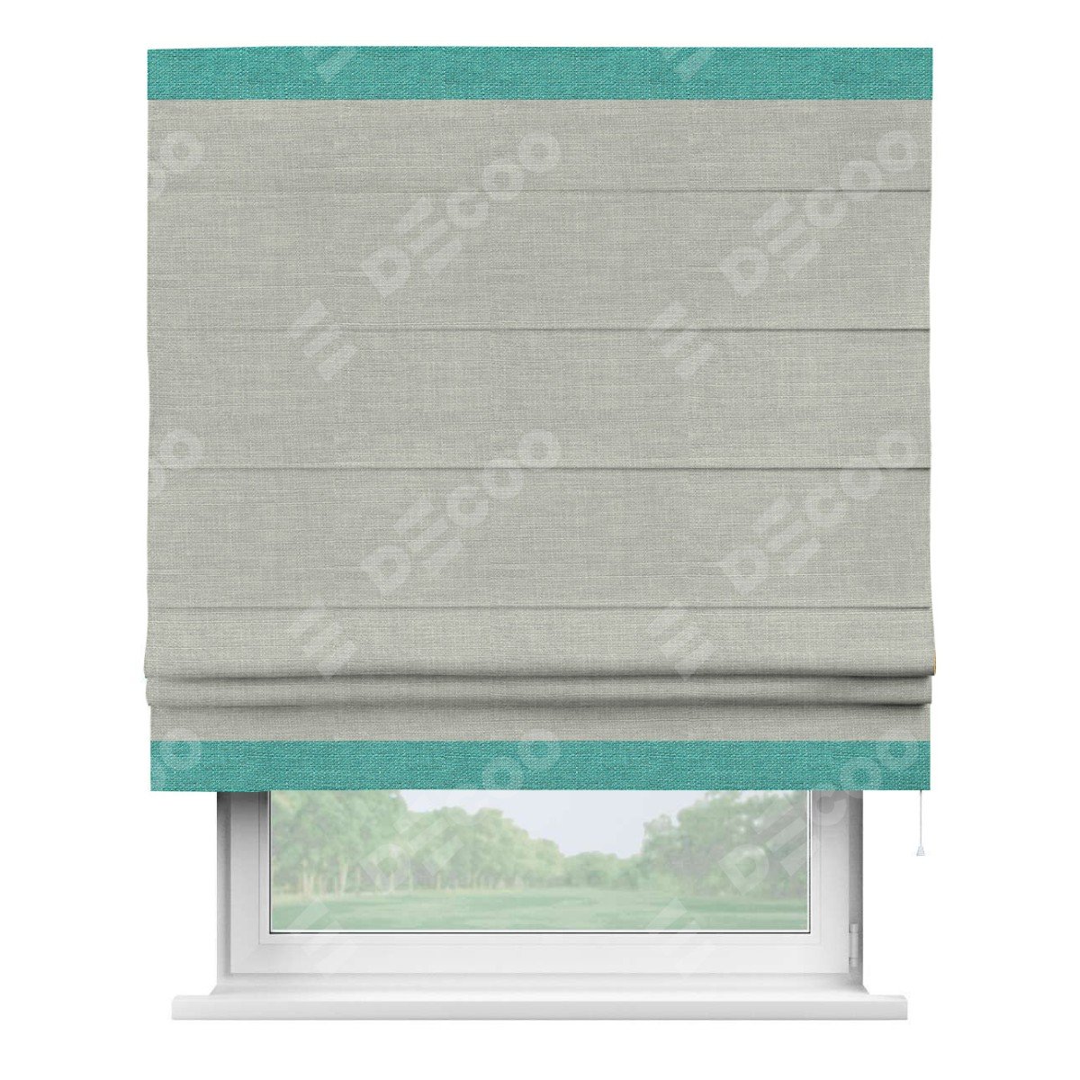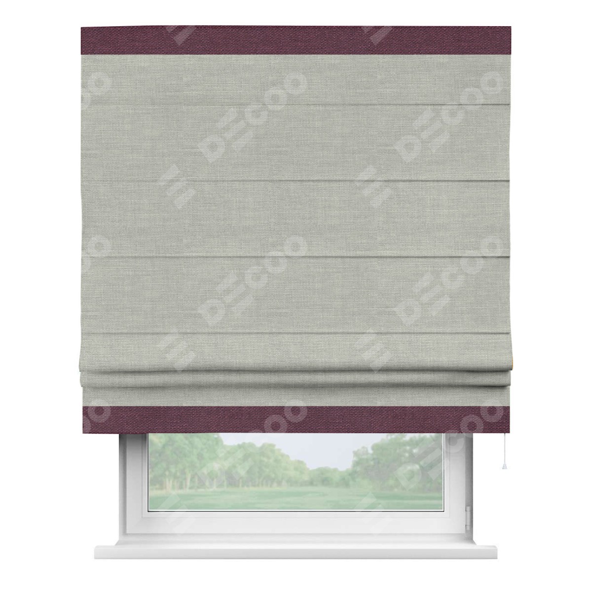 Римская штора производителя «Cortin», используется для проёма, пошита из ткани лён серый, артикул 7440. Отделка шторы кантом «Горизонт», ткань для канта используется из льна разной расцветки на выбор. Имеет универсальный механизм и подходит для монтажа: на потолок, на стену и в нишу.