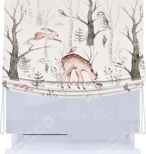 Римская штора день-ночь производителя «Cortin», используется для проёма, пошита из двух полотен, с лицевой блэкаут с нанесением сублимационной печати «Скандинавский питомник», вторая ткань тюль (по стандарту комплектуется тюль белого цвета артикул V-01). Имеет универсальный механизм и подходит для монтажа: на потолок, на стену и в нишу. Удобное управление каждой шторой отдельно.