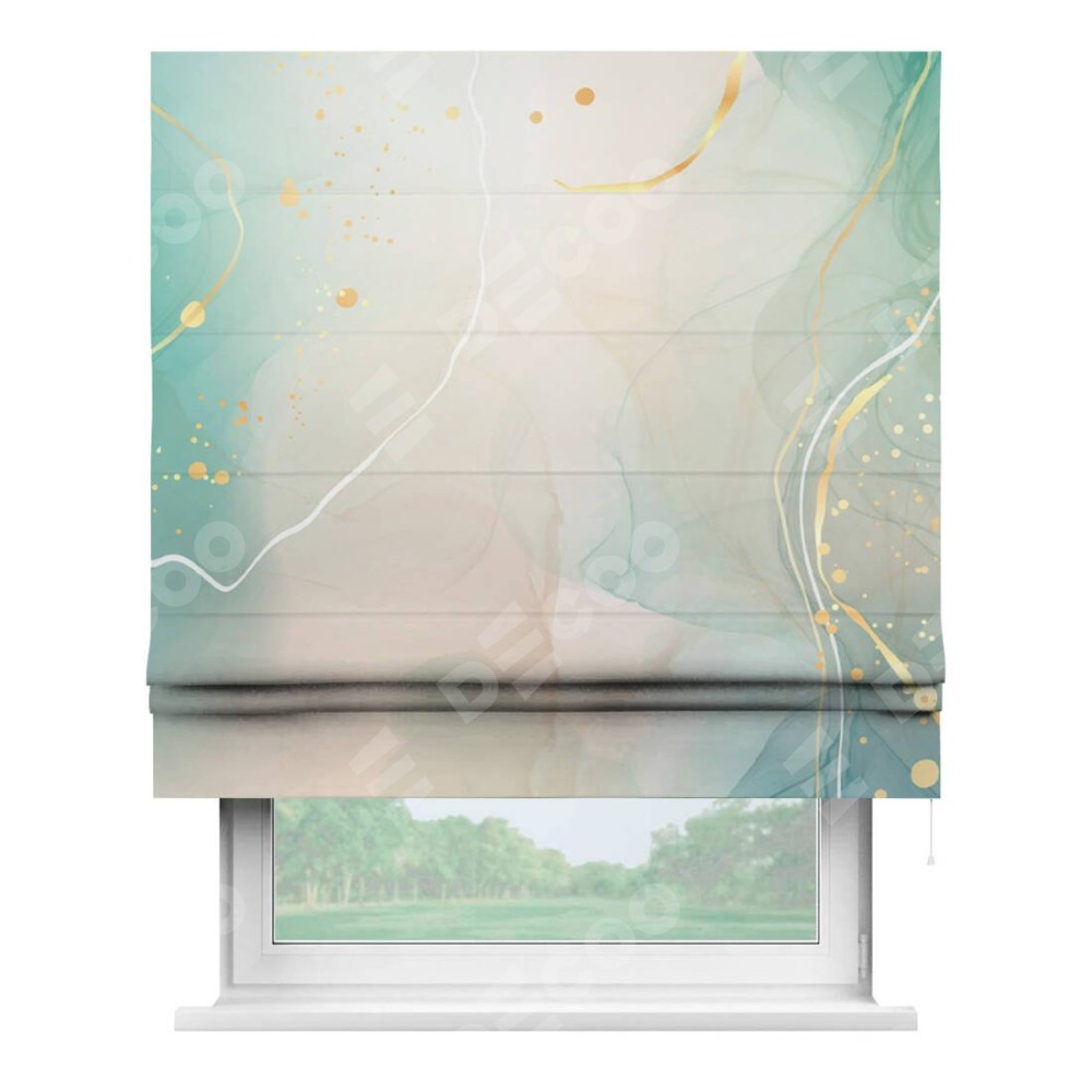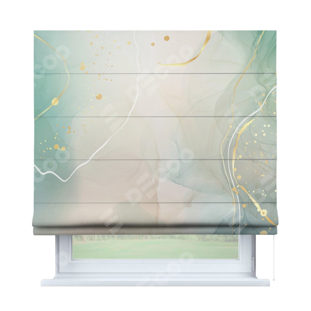 Римская штора производителя «Cortin», используется для проёма, пошита из ткани блэкаут с нанесением сублимационной печати «Изумрудно-серый мрамор». Имеет универсальный механизм и подходит для монтажа: на потолок, на стену и в нишу.