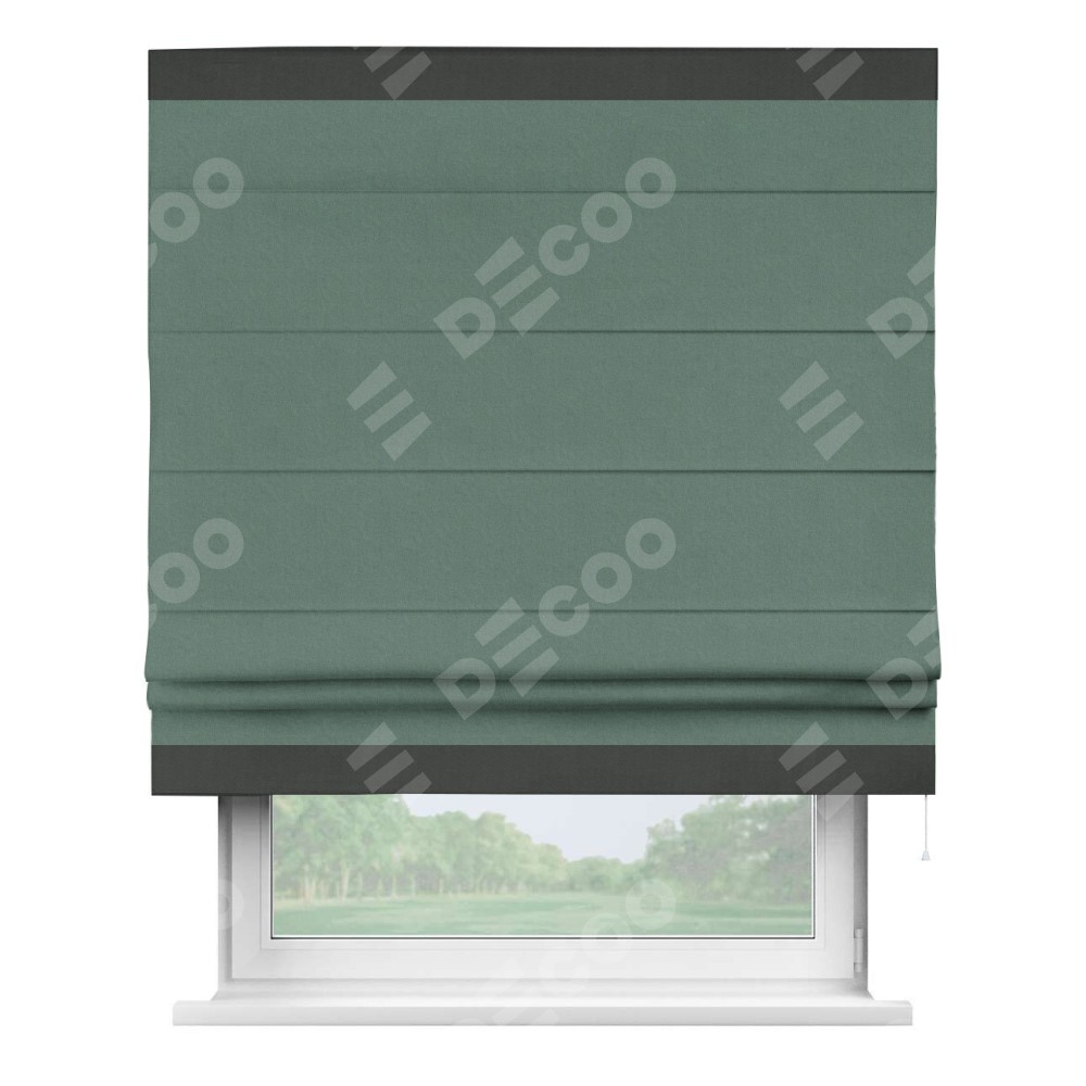 Римская штора производителя «Cortin», используется для проёма, пошита из ткани лён блэкаут бирюзовый, артикул 69517. Отделка шторы кантом «Горизонт», ткань для канта используется из льна разной расцветки на выбор. Имеет универсальный механизм и подходит для монтажа: на потолок, на стену и в нишу.