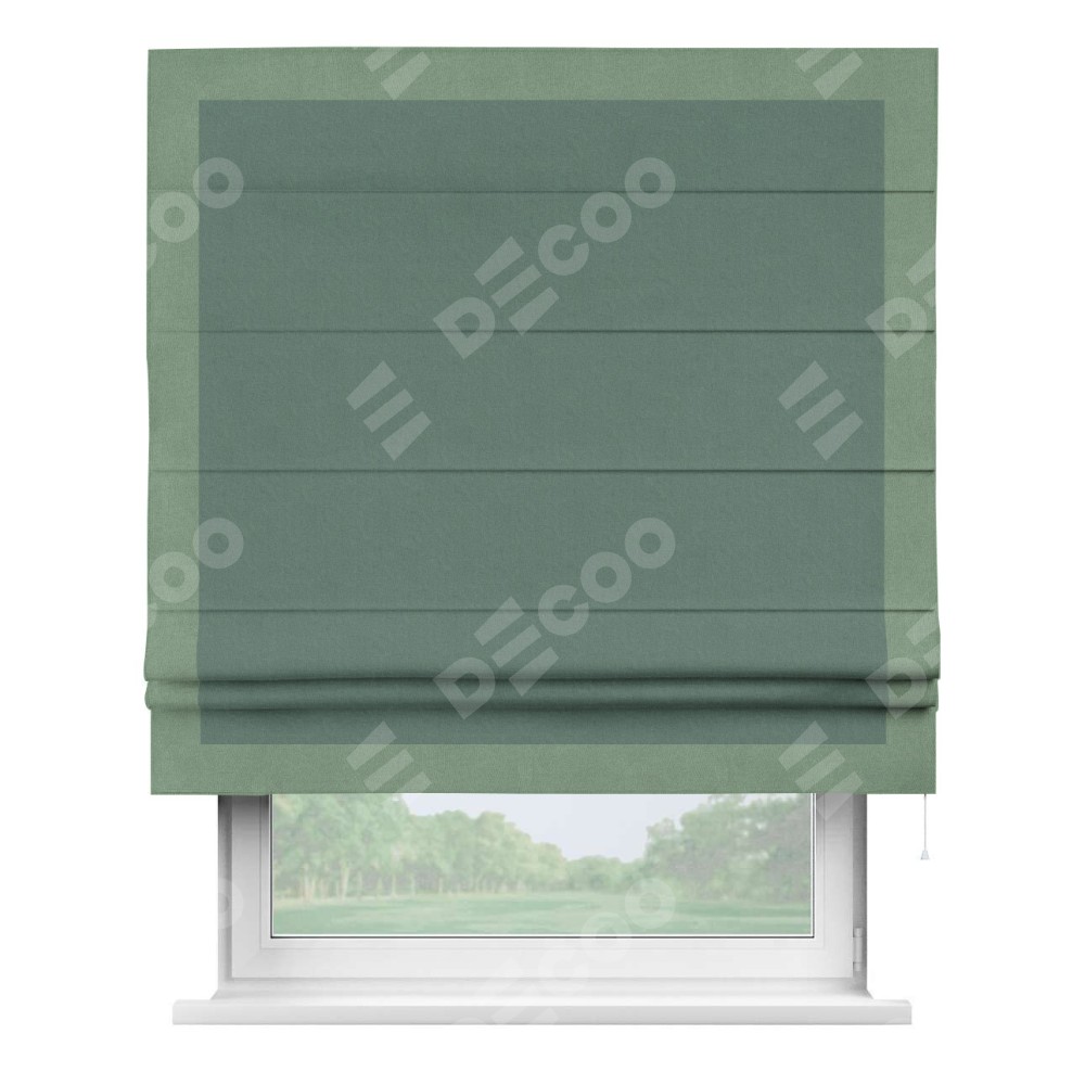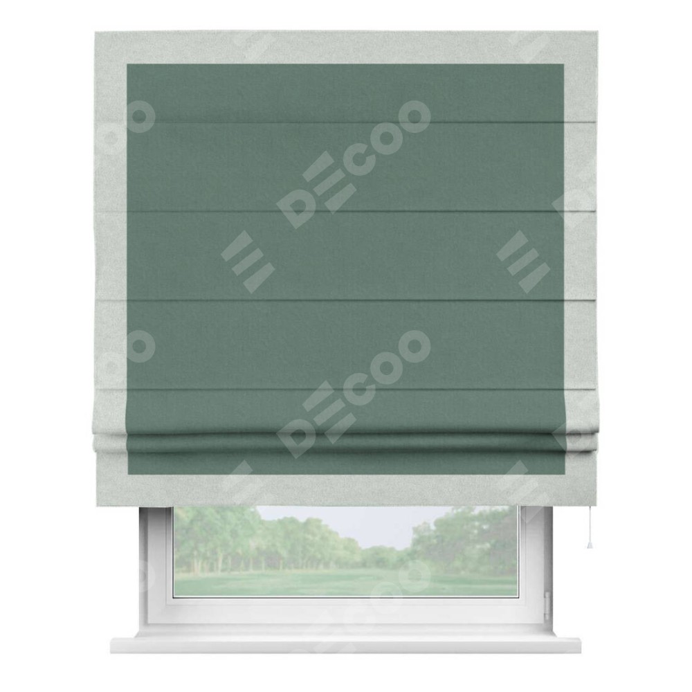 Римская штора производителя «Cortin», используется для проёма, пошита из ткани лён блэкаут бирюзовый, артикул 69517. Отделка шторы кантом «Чесс», ткань для канта используется из льна разной расцветки на выбор. Имеет универсальный механизм и подходит для монтажа: на потолок, на стену и в нишу.