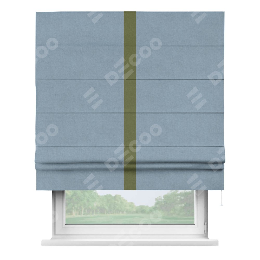 Римская штора производителя «Cortin», используется для проёма, пошита из ткани лён блэкаут голубой, артикул 69574. Отделка шторы кантом «Хайвэй», ткань для канта используется из льна разной расцветки на выбор. Имеет универсальный механизм и подходит для монтажа: на потолок, на стену и в нишу.