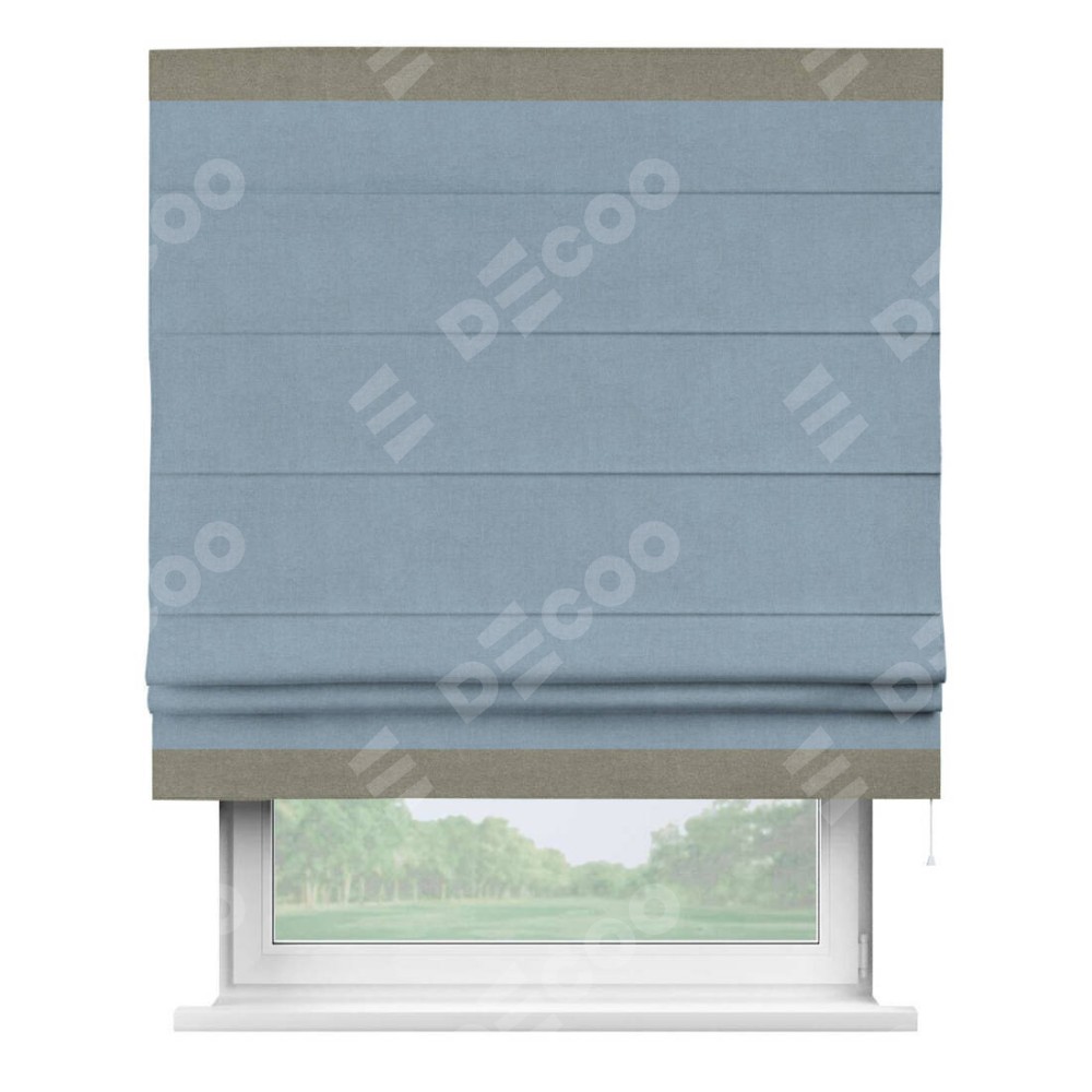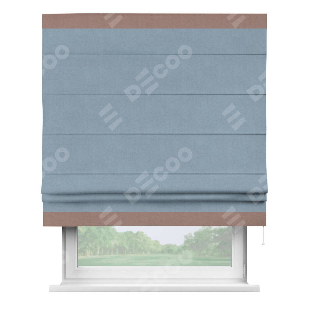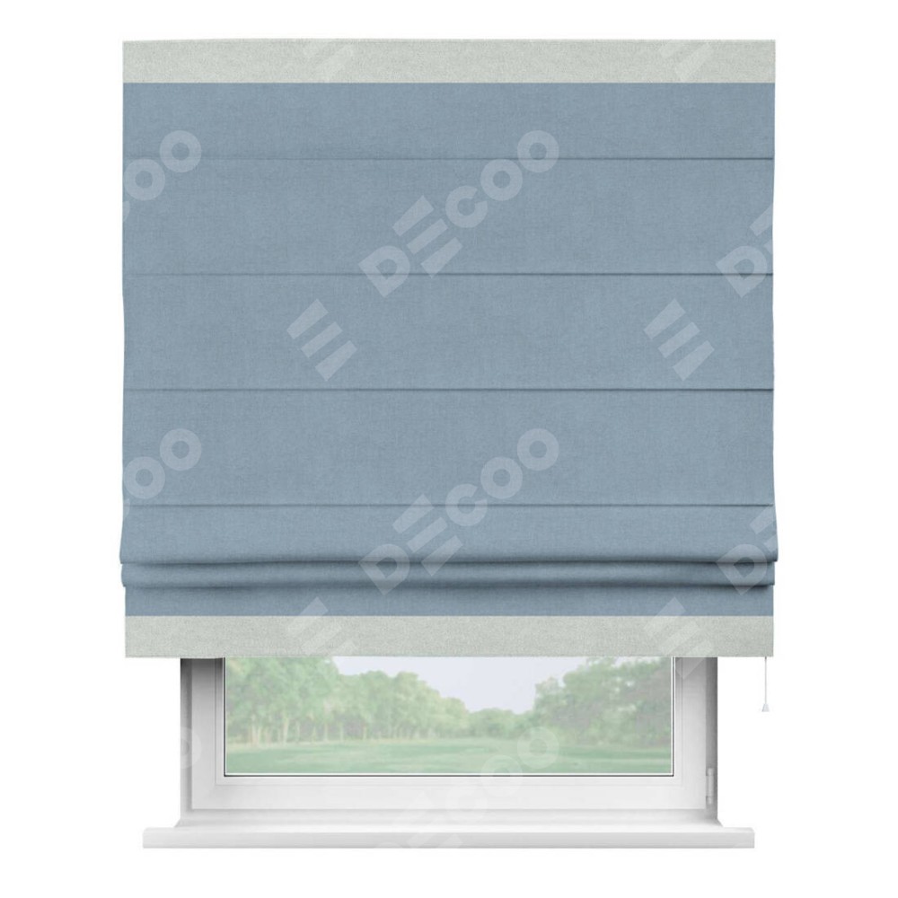 Римская штора производителя «Cortin», используется для проёма, пошита из ткани лён блэкаут голубой, артикул 69574. Отделка шторы кантом «Горизонт», ткань для канта используется из льна разной расцветки на выбор. Имеет универсальный механизм и подходит для монтажа: на потолок, на стену и в нишу.
