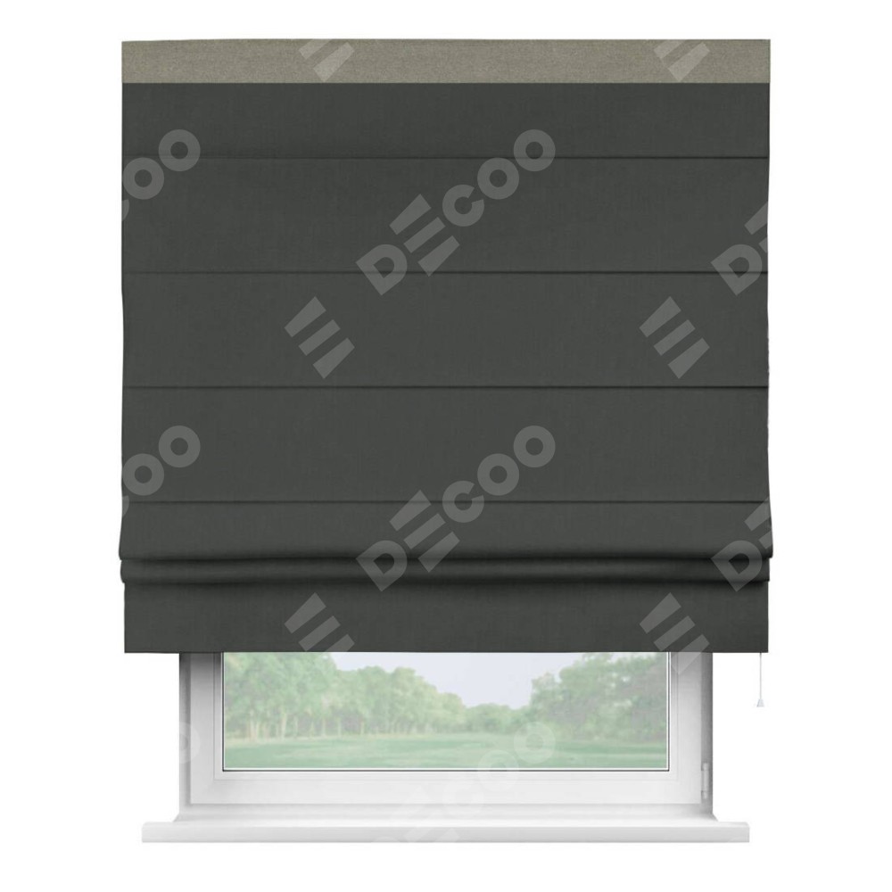 Римская штора производителя «Cortin», используется для проёма, пошита из ткани лён блэкаут графит, артикул 69448. Отделка шторы кантом «Кинг», ткань для канта используется из льна разной расцветки на выбор. Имеет универсальный механизм и подходит для монтажа: на потолок, на стену и в нишу.