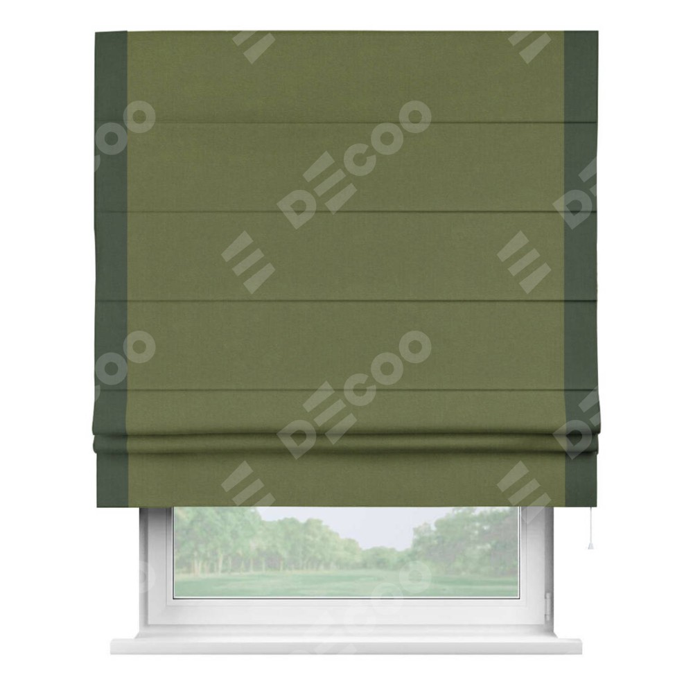 Римская штора производителя «Cortin», используется для проёма, пошита из ткани лён блэкаут оливковый, артикул 69516. Отделка шторы кантом «Стрим Дуо», ткань для канта используется из льна разной расцветки на выбор. Имеет универсальный механизм и подходит для монтажа: на потолок, на стену и в нишу.