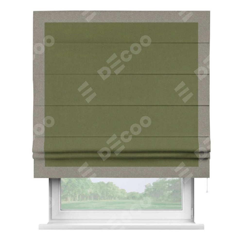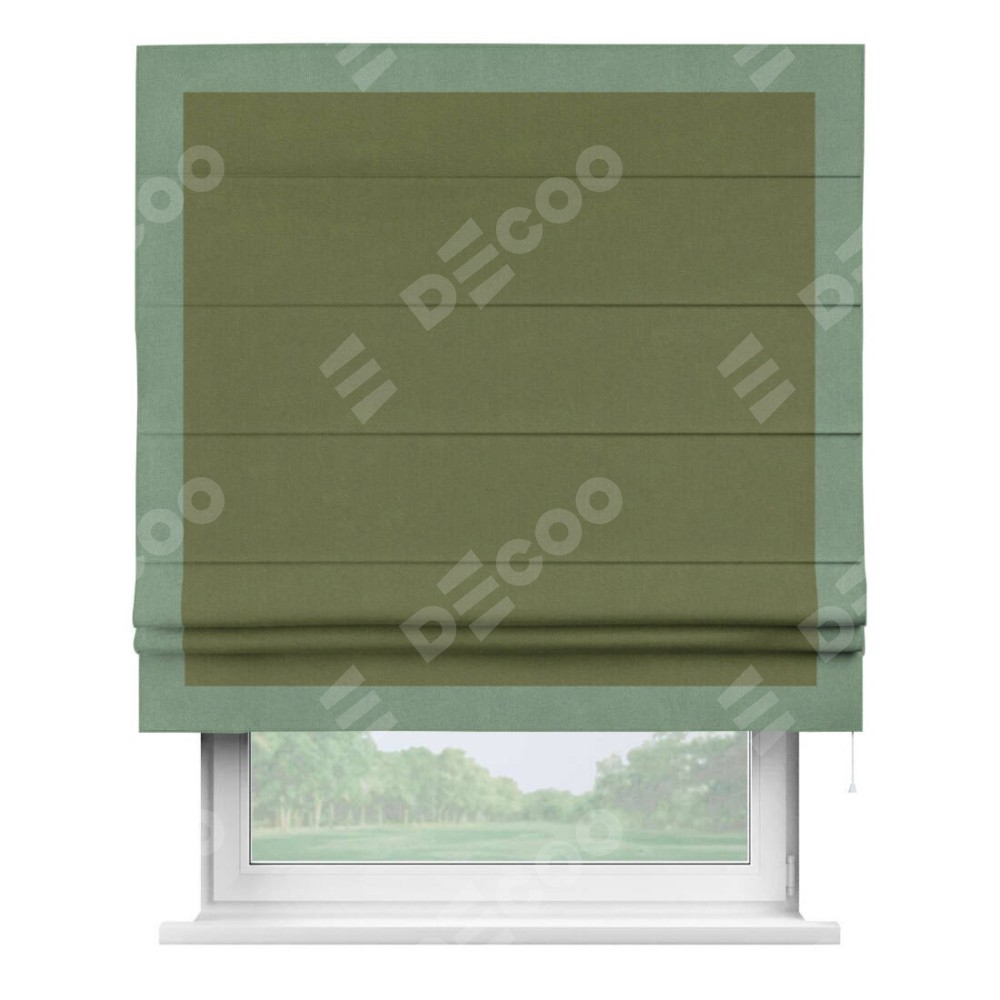 Римская штора производителя «Cortin», используется для проёма, пошита из ткани лён блэкаут оливковый, артикул 69516. Отделка шторы кантом «Чесс», ткань для канта используется из льна разной расцветки на выбор. Имеет универсальный механизм и подходит для монтажа: на потолок, на стену и в нишу.