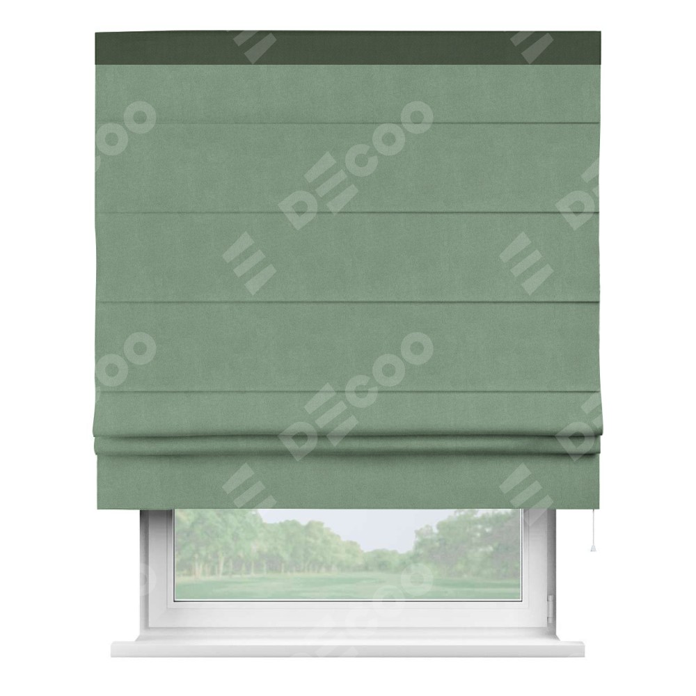 Римская штора производителя «Cortin», используется для проёма, пошита из ткани лён блэкаут светло-бирюзовый, артикул 69443. Отделка шторы кантом «Кинг», ткань для канта используется из льна разной расцветки на выбор. Имеет универсальный механизм и подходит для монтажа: на потолок, на стену и в нишу.