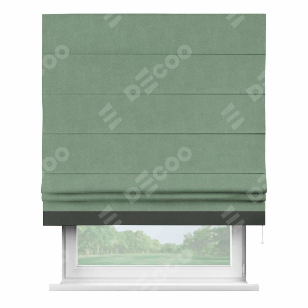 Римская штора производителя «Cortin», используется для проёма, пошита из ткани лён блэкаут светло-бирюзовый, артикул 69443. Отделка шторы кантом «Джестер», ткань для канта используется из льна разной расцветки на выбор. Имеет универсальный механизм и подходит для монтажа: на потолок, на стену и в нишу.