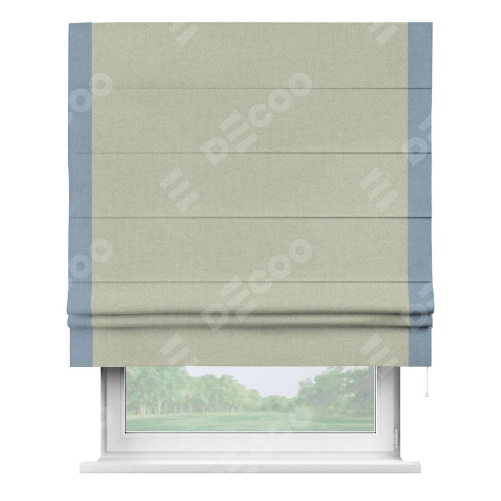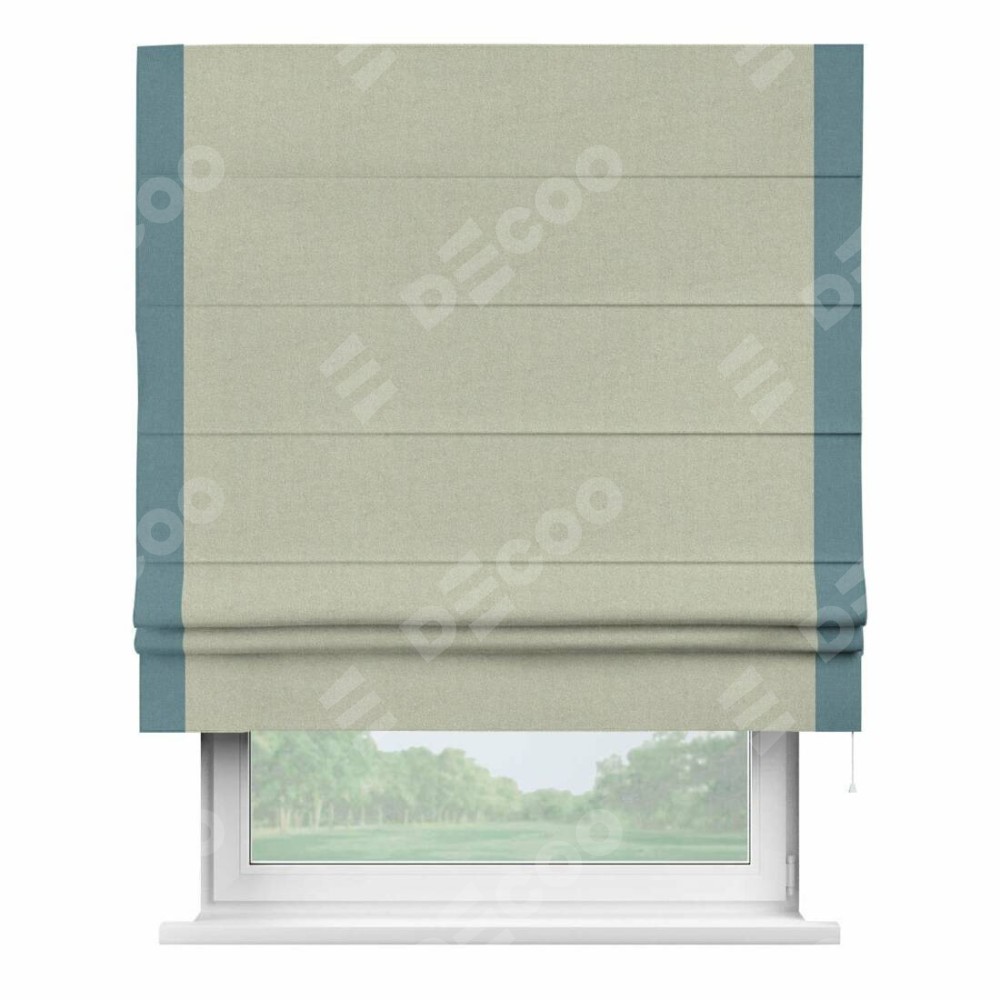 Римская штора производителя «Cortin», используется для проёма, пошита из ткани лён блэкаут серо-бежевый, артикул 69450. Отделка шторы кантом «Стрим Дуо», ткань для канта используется из льна разной расцветки на выбор. Имеет универсальный механизм и подходит для монтажа: на потолок, на стену и в нишу.
