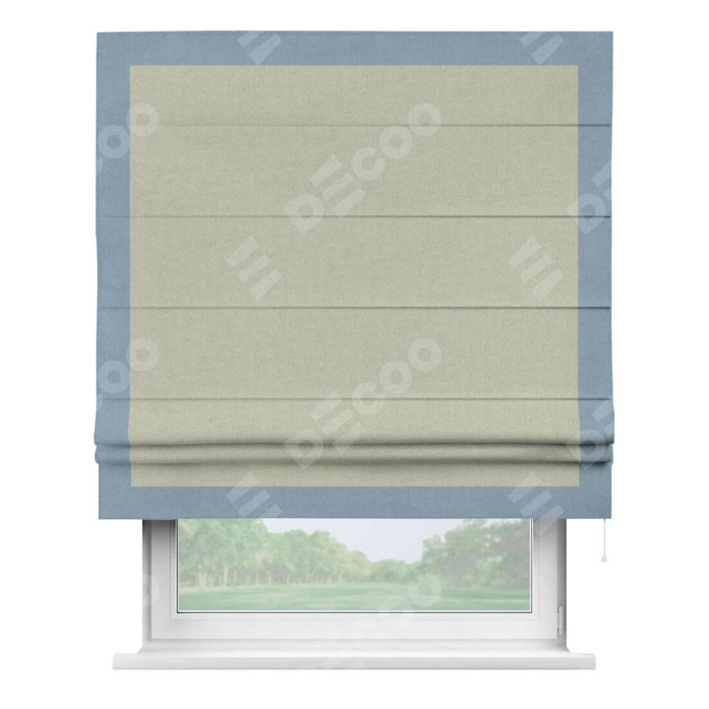 Римская штора производителя «Cortin», используется для проёма, пошита из ткани лён блэкаут серо-бежевый, артикул 69450. Отделка шторы кантом «Чесс», ткань для канта используется из льна разной расцветки на выбор. Имеет универсальный механизм и подходит для монтажа: на потолок, на стену и в нишу.