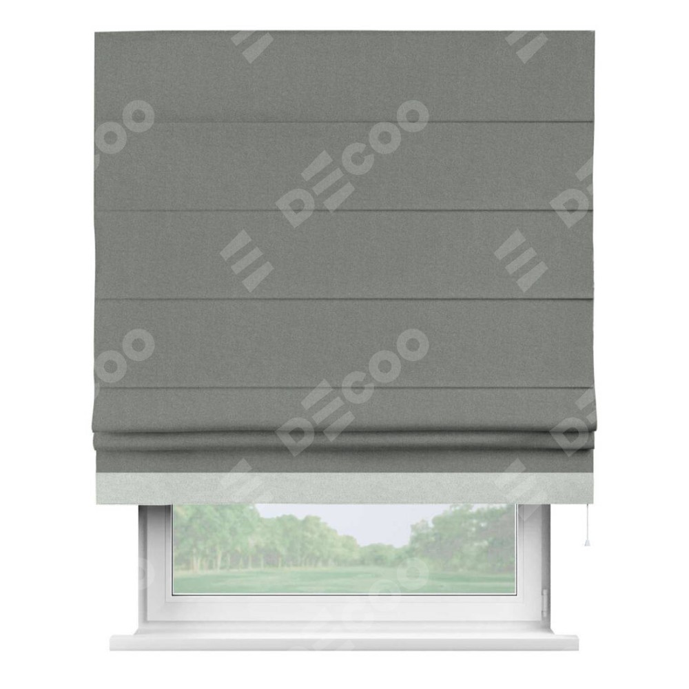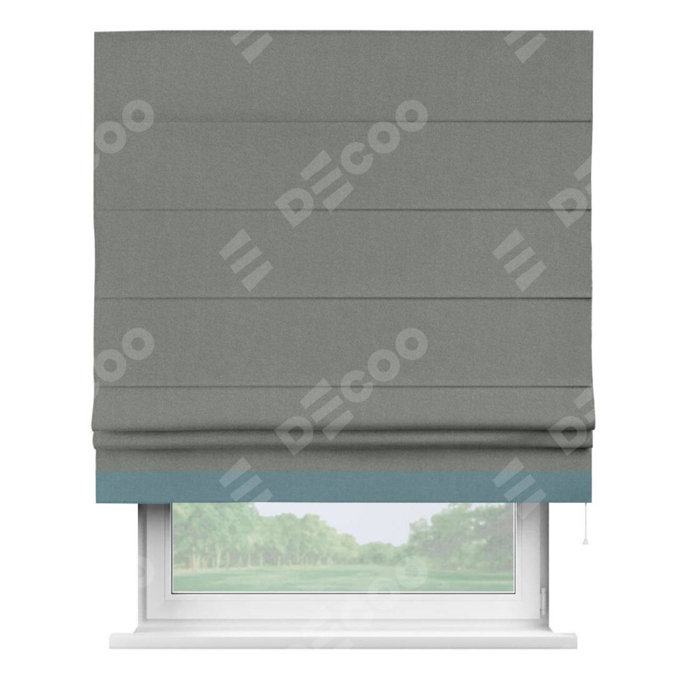 Римская штора производителя «Cortin», используется для проёма, пошита из ткани лён блэкаут серый, артикул 69447. Отделка шторы кантом «Джестер», ткань для канта используется из льна разной расцветки на выбор. Имеет универсальный механизм и подходит для монтажа: на потолок, на стену и в нишу.