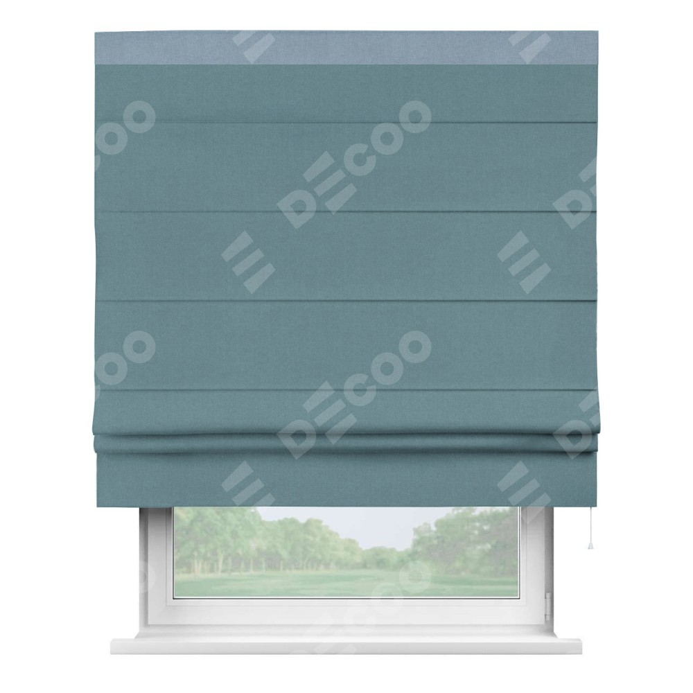 Римская штора производителя «Cortin», используется для проёма, пошита из ткани лён блэкаут синий, артикул 69528. Отделка шторы кантом «Кинг», ткань для канта используется из льна разной расцветки на выбор. Имеет универсальный механизм и подходит для монтажа: на потолок, на стену и в нишу.