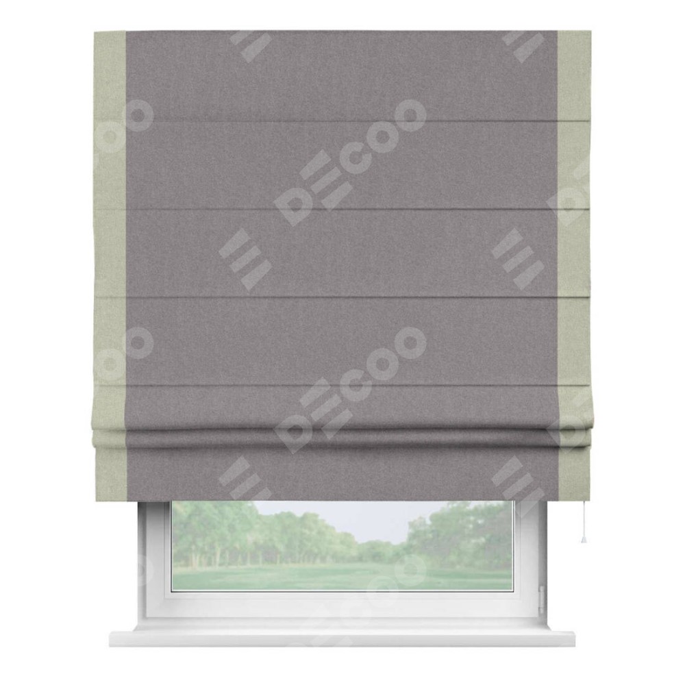 Римская штора производителя «Cortin», используется для проёма, пошита из ткани лён блэкаут сиреневый, артикул 69576. Отделка шторы кантом «Стрим Дуо», ткань для канта используется из льна разной расцветки на выбор. Имеет универсальный механизм и подходит для монтажа: на потолок, на стену и в нишу.
