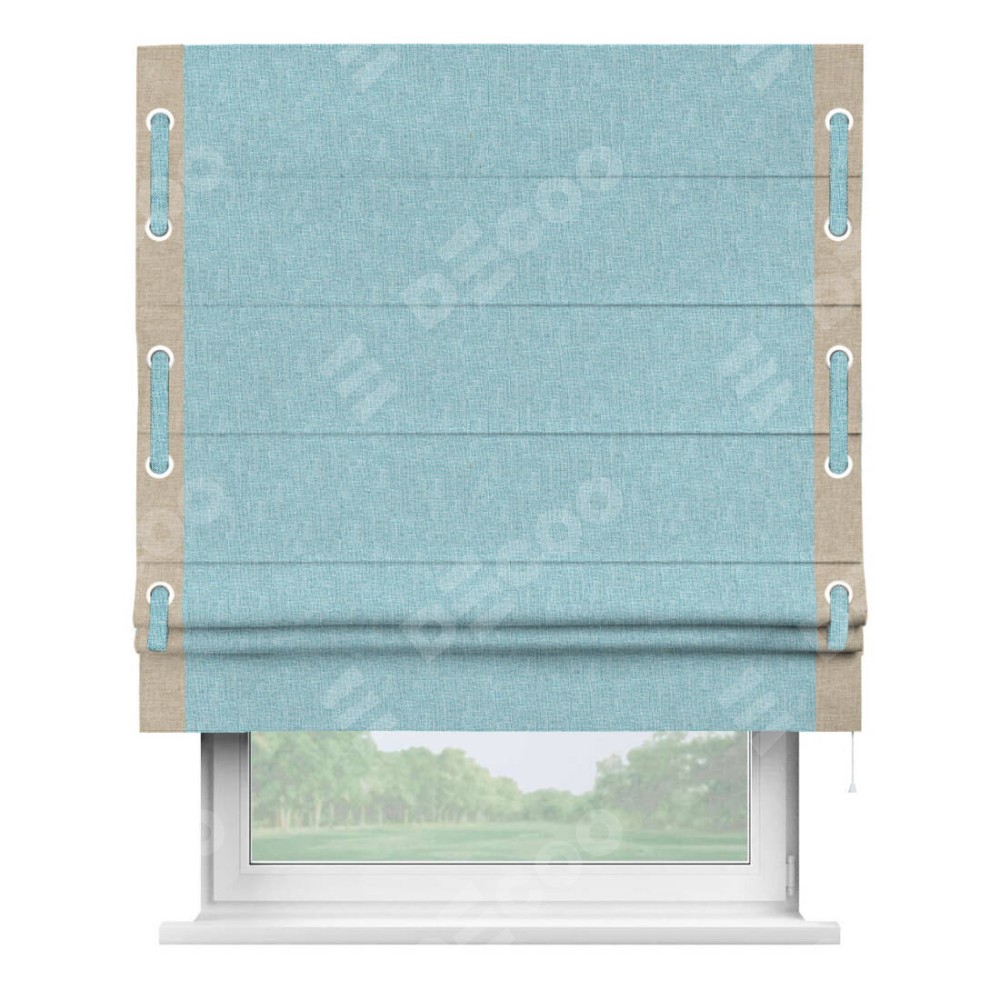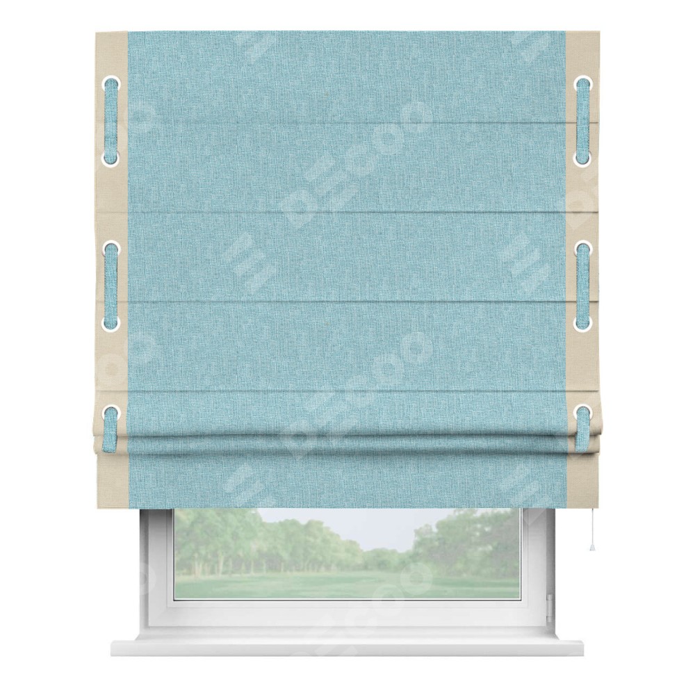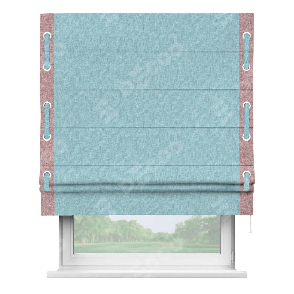 Римская штора производителя «Cortin», используется для проёма, пошита из ткани лён кашемир голубой, артикул 21616. Отделка шторы кантом «Стрим Дуо» на кантах расположены люверсы с пояском, ткань для канта используется из льна разной расцветки на выбор. Ткань для пояска обычно используется из основной ткани шторы, а так же можно сделать из любой расцветки по желанию. Имеет универсальный механизм и подходит для монтажа: на потолок, на стену и в нишу.