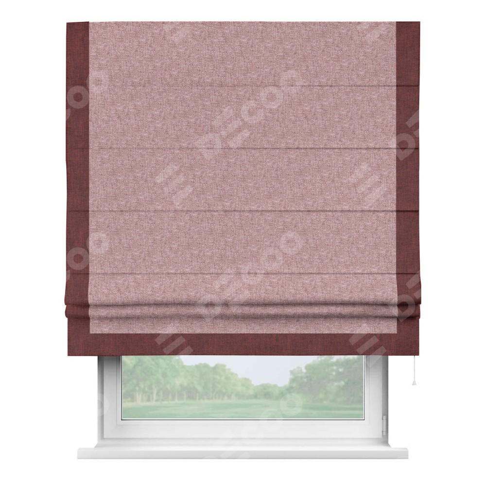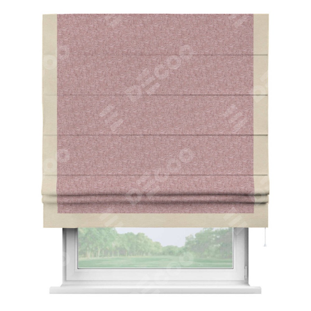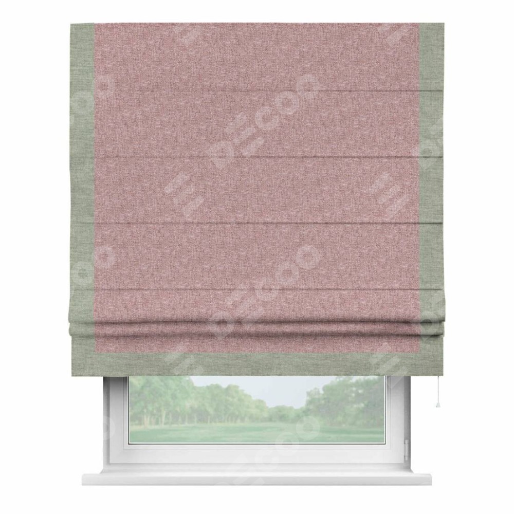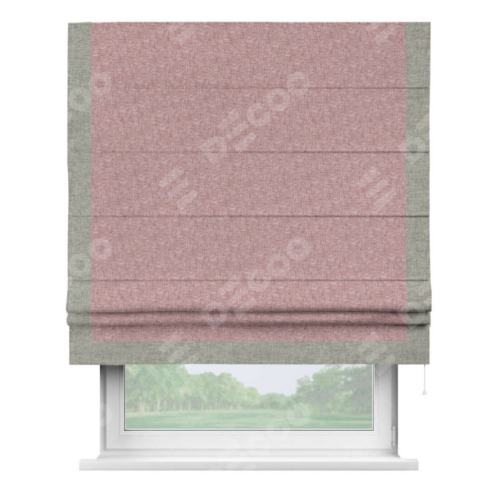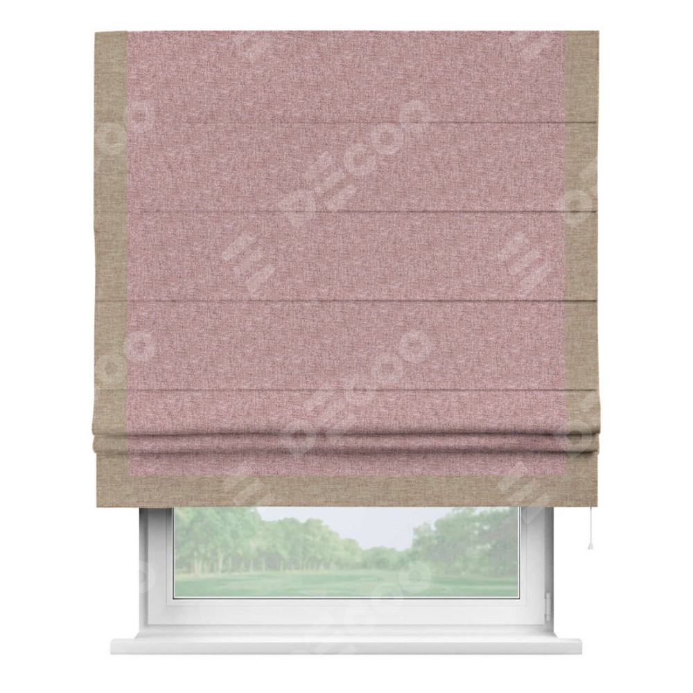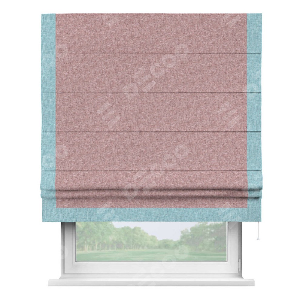 Римская штора производителя «Cortin», используется для проёма, пошита из ткани лён кашемир розовая пудра, артикул 21619. Отделка шторы кантом «Виктория», ткань для канта используется из льна разной расцветки на выбор. Имеет универсальный механизм и подходит для монтажа: на потолок, на стену и в нишу.