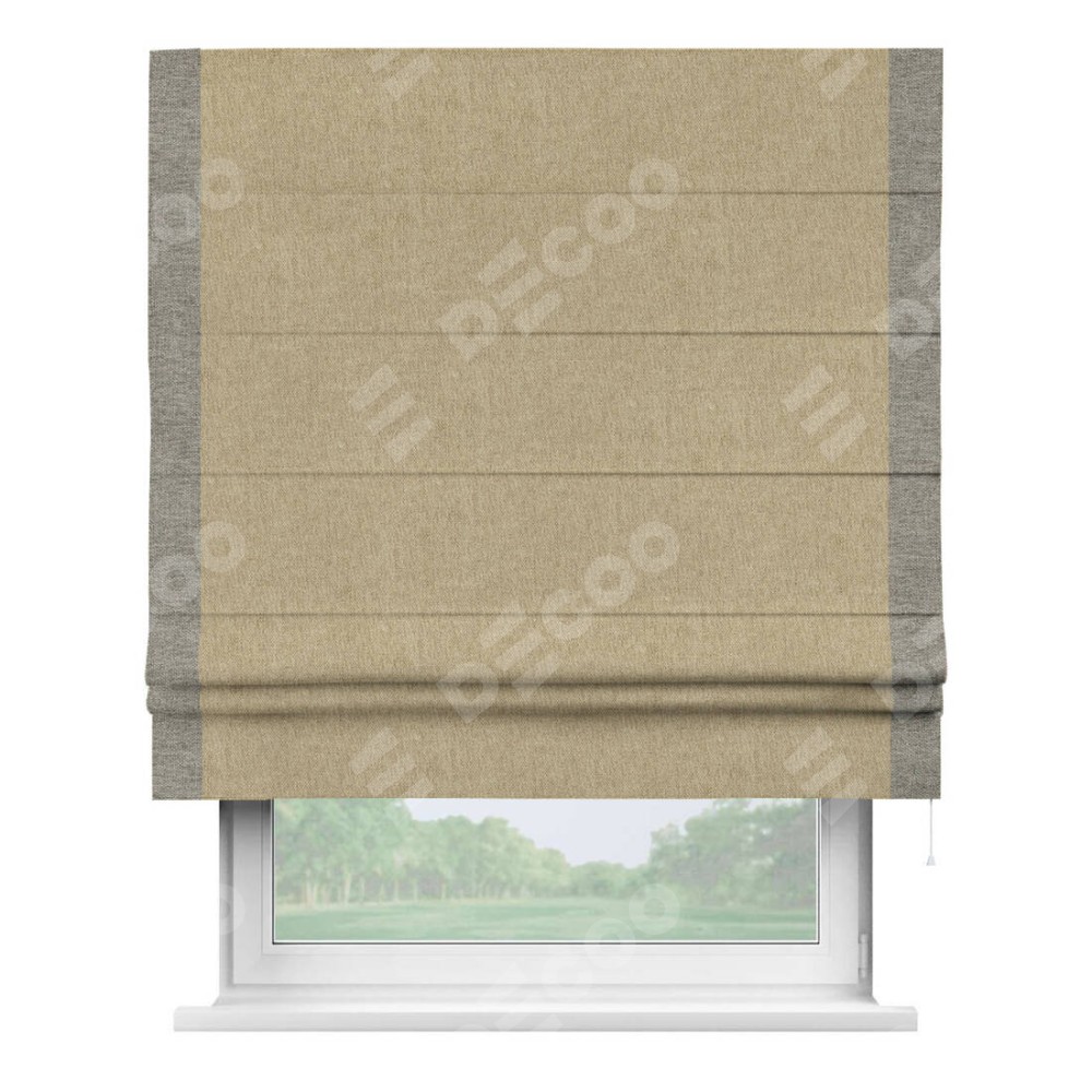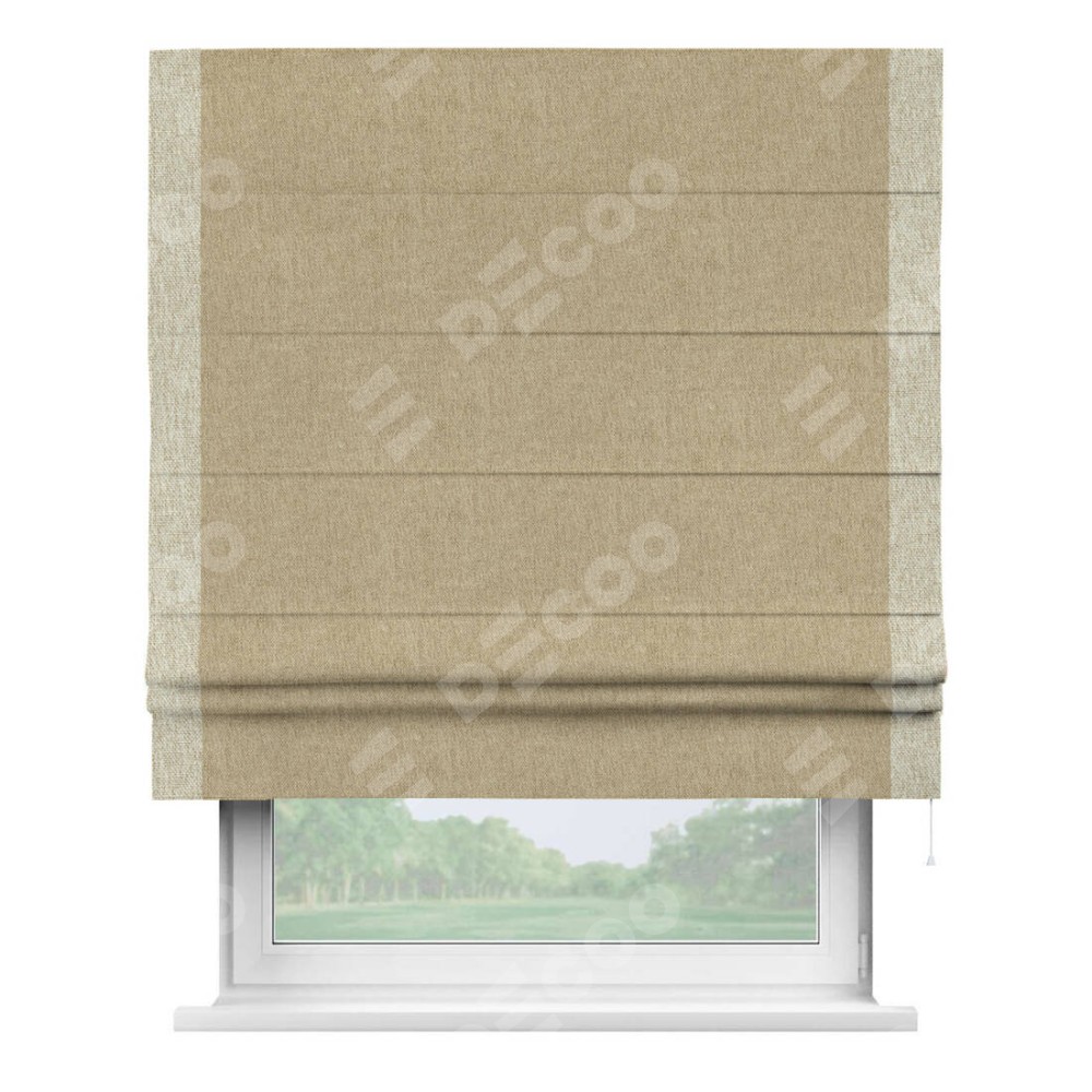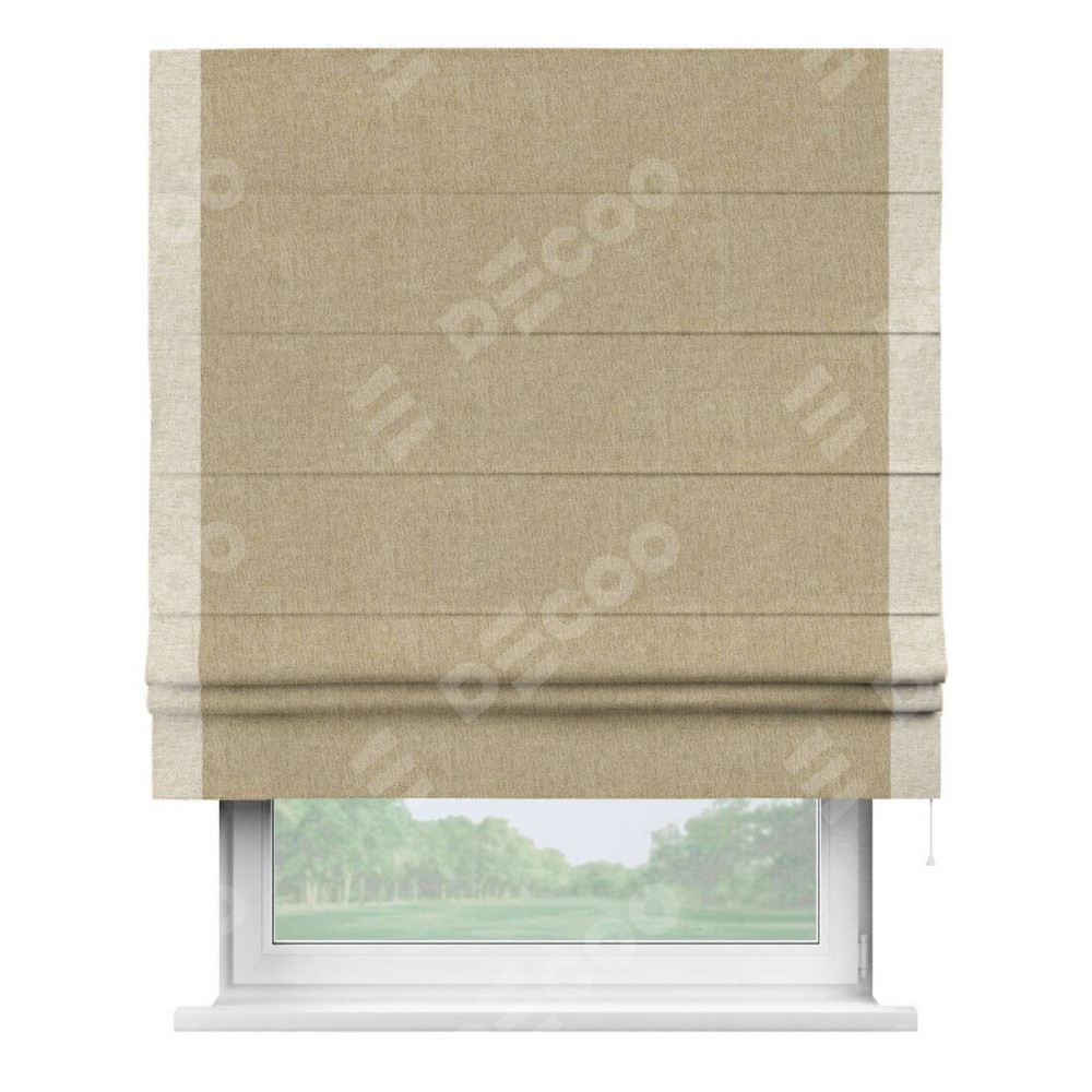Римская штора производителя «Cortin», используется для проёма, пошита из ткани стиф димаут бежевый, артикул 18083. Отделка шторы кантом «Стрим Дуо», ткань для канта используется из стифа разной расцветки на выбор. Имеет универсальный механизм и подходит для монтажа: на потолок, на стену и в нишу.