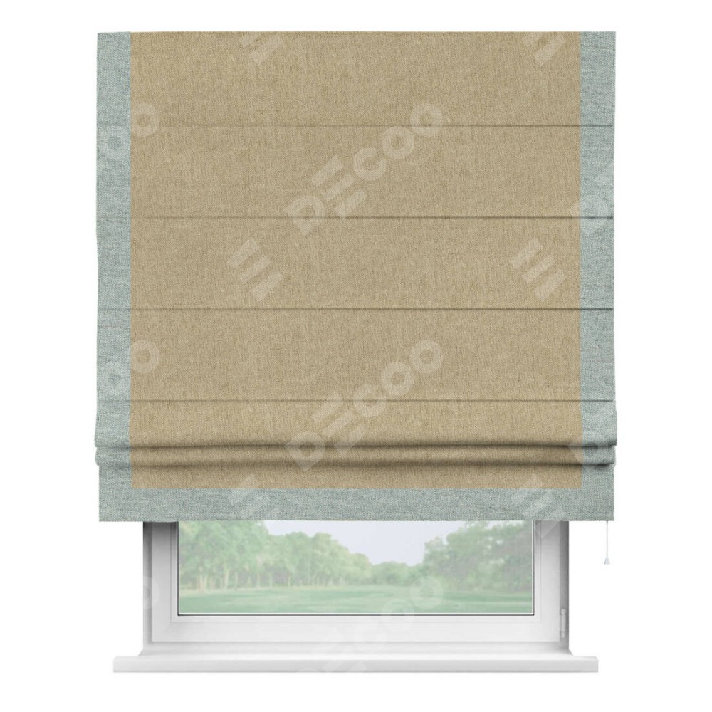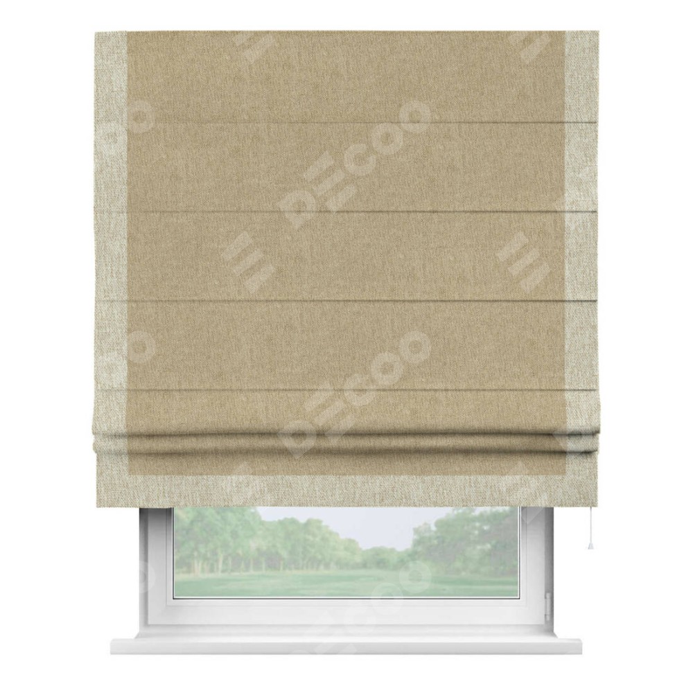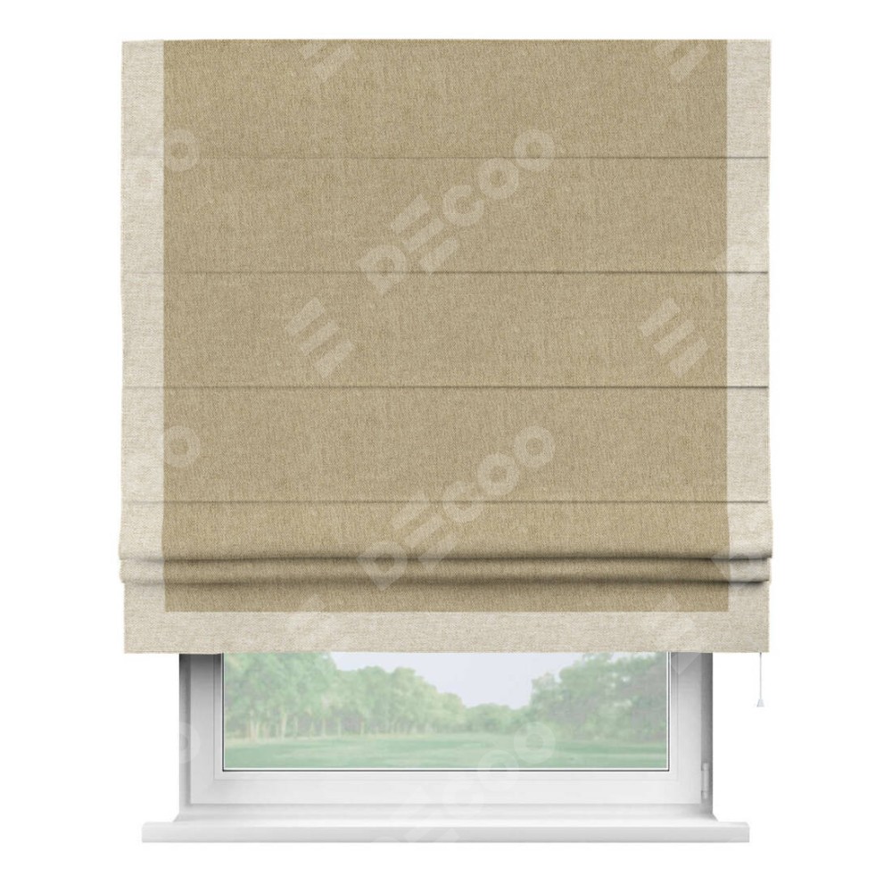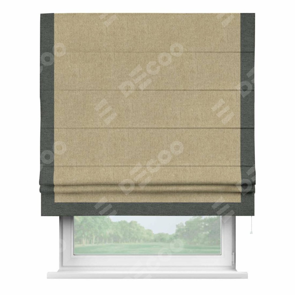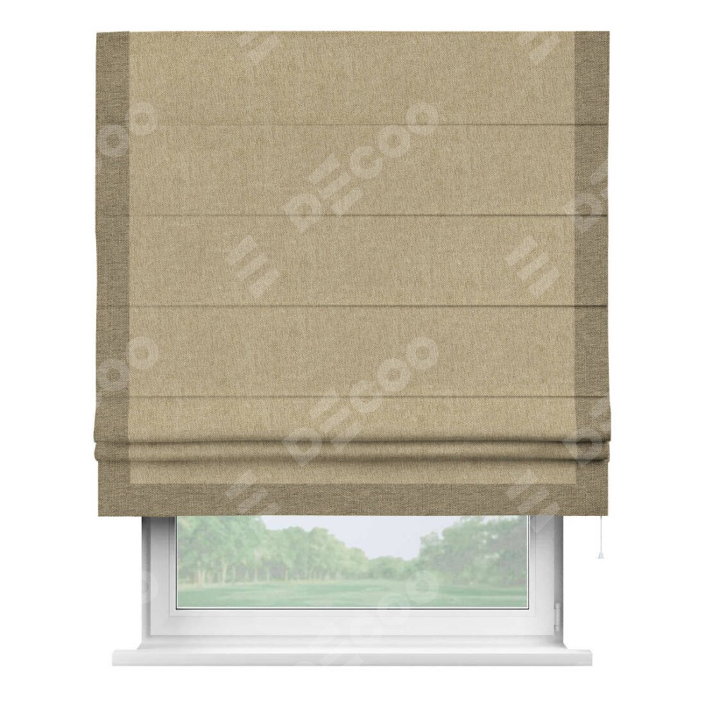 Римская штора производителя «Cortin», используется для проёма, пошита из ткани стиф димаут бежевый, артикул 18083. Отделка шторы кантом «Виктория», ткань для канта используется из стифа разной расцветки на выбор. Имеет универсальный механизм и подходит для монтажа: на потолок, на стену и в нишу.