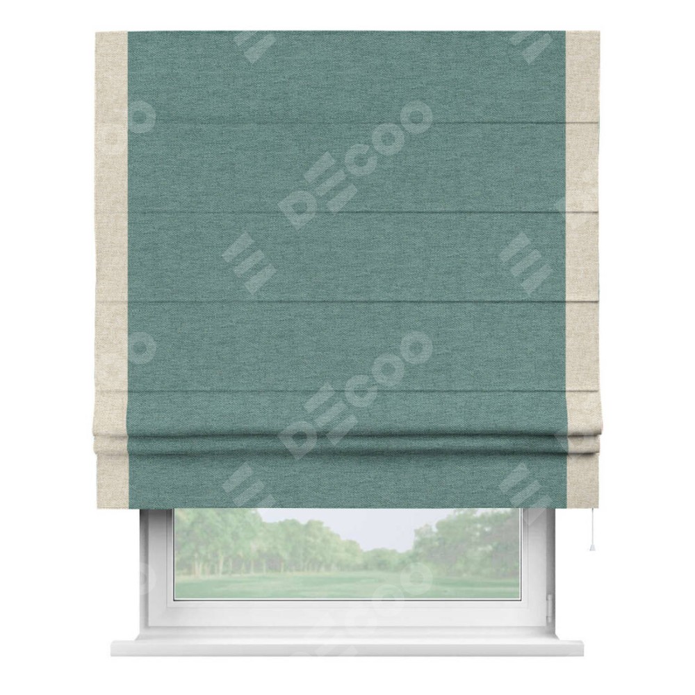 Римская штора производителя «Cortin», используется для проёма, пошита из ткани стиф димаут бирюзовый, артикул 18196. Отделка шторы кантом «Стрим Дуо», ткань для канта используется из стифа разной расцветки на выбор. Имеет универсальный механизм и подходит для монтажа: на потолок, на стену и в нишу.