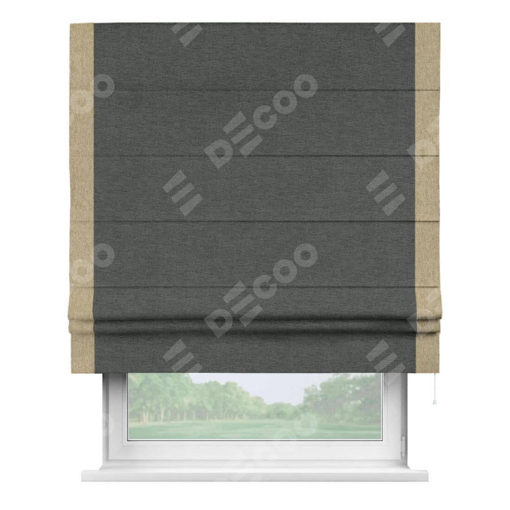 Римская штора производителя «Cortin», используется для проёма, пошита из ткани стиф димаут графит, артикул 44026. Отделка шторы кантом «Стрим Дуо», ткань для канта используется из стифа разной расцветки на выбор. Имеет универсальный механизм и подходит для монтажа: на потолок, на стену и в нишу.