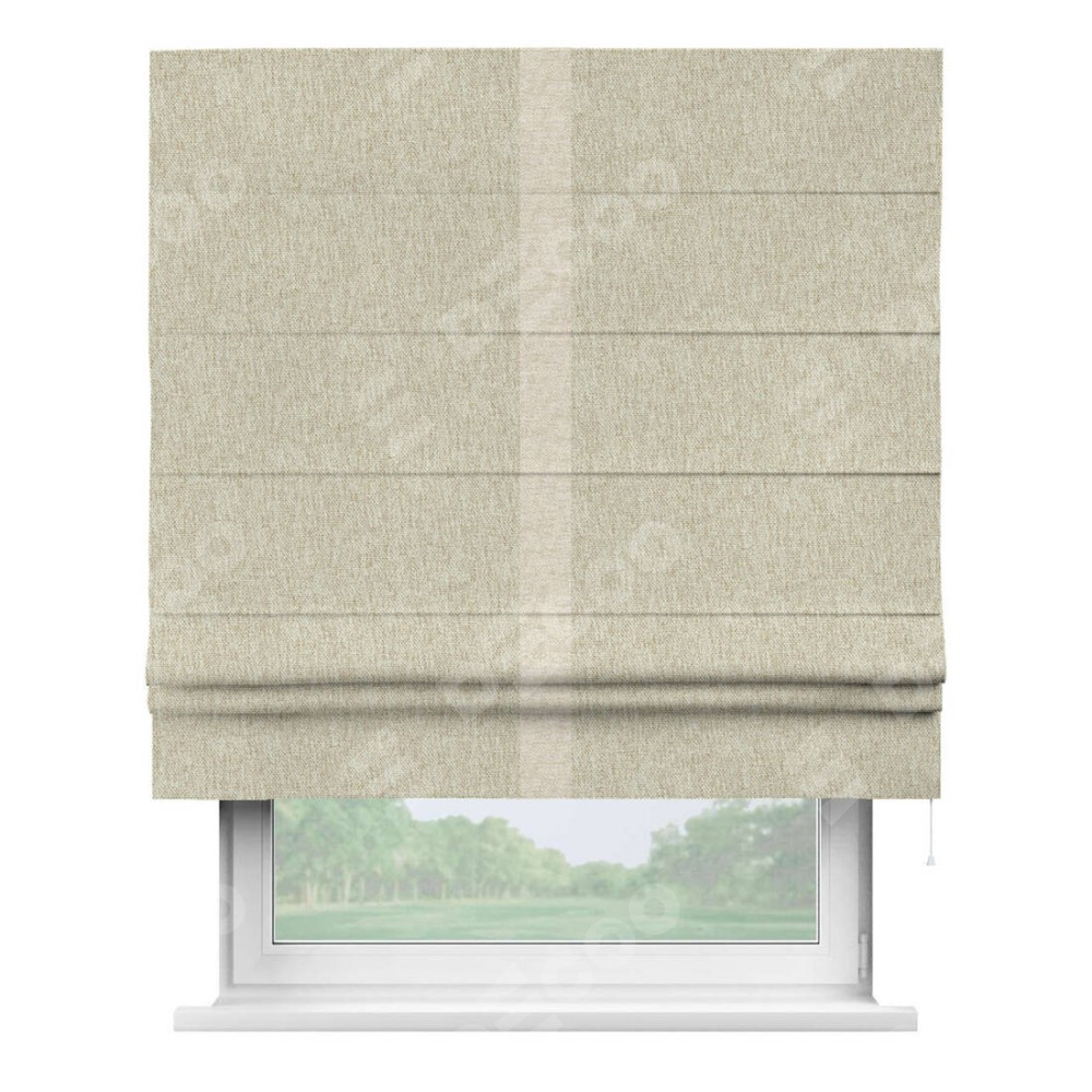 Римская штора производителя «Cortin», используется для проёма, пошита из ткани стиф димаут светло-бежевый, артикул 18084. Отделка шторы кантом «Хайвэй», ткань для канта используется из стифа разной расцветки на выбор. Имеет универсальный механизм и подходит для монтажа: на потолок, на стену и в нишу.