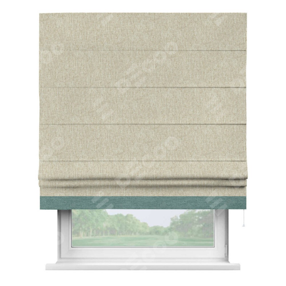 Римская штора производителя «Cortin», используется для проёма, пошита из ткани стиф димаут светло-бежевый, артикул 18084. Отделка шторы кантом «Джестер», ткань для канта используется из стифа разной расцветки на выбор. Имеет универсальный механизм и подходит для монтажа: на потолок, на стену и в нишу.
