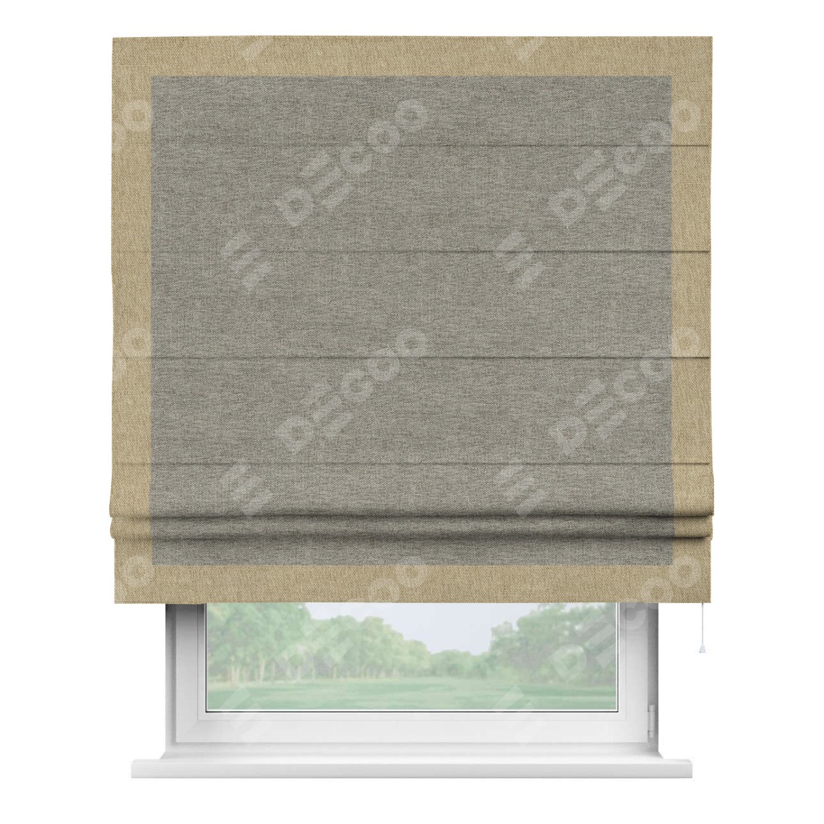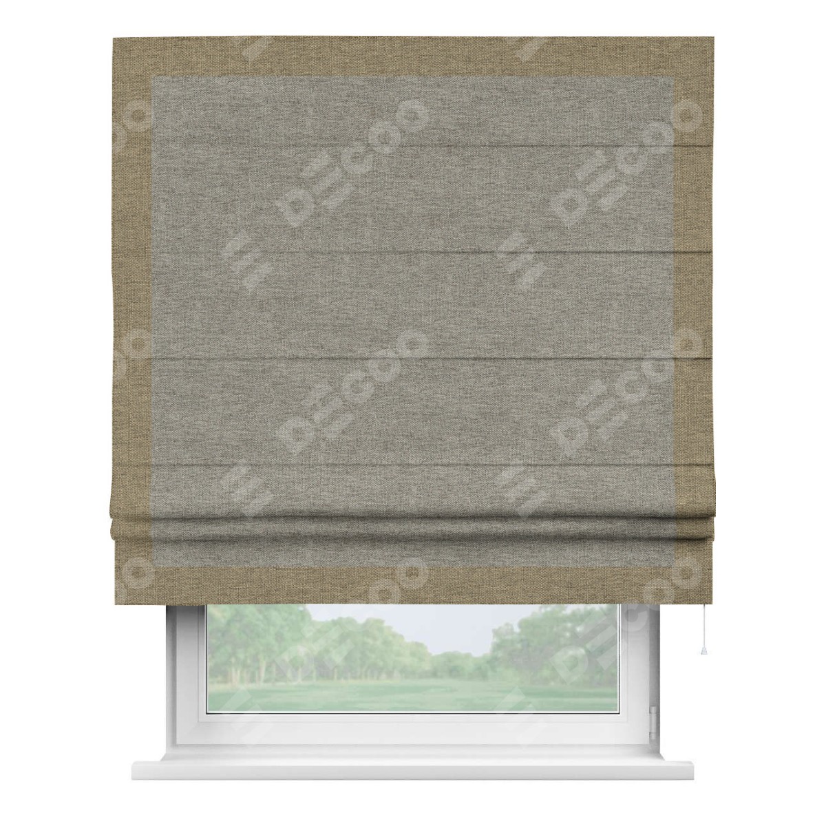 Римская штора производителя «Cortin», используется для проёма, пошита из ткани стиф димаут серо-коричневый, артикул 44028. Отделка шторы кантом «Чесс», ткань для канта используется из стифа разной расцветки на выбор. Имеет универсальный механизм и подходит для монтажа: на потолок, на стену и в нишу.