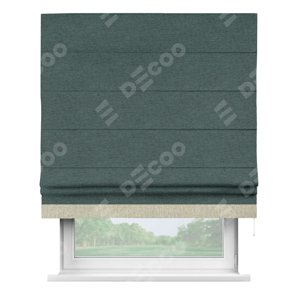Римская штора производителя «Cortin», используется для проёма, пошита из ткани стиф димаут сине-зелёный, артикул 18194. Отделка шторы кантом «Джестер», ткань для канта используется из стифа разной расцветки на выбор. Имеет универсальный механизм и подходит для монтажа: на потолок, на стену и в нишу.