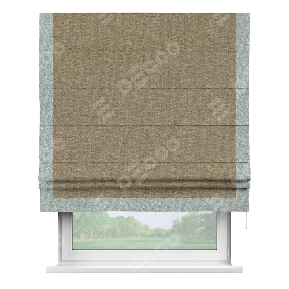 Римская штора производителя «Cortin», используется для проёма, пошита из ткани стиф димаут тёмно-бежевый, артикул 18085. Отделка шторы кантом «Виктория», ткань для канта используется из стифа разной расцветки на выбор. Имеет универсальный механизм и подходит для монтажа: на потолок, на стену и в нишу.