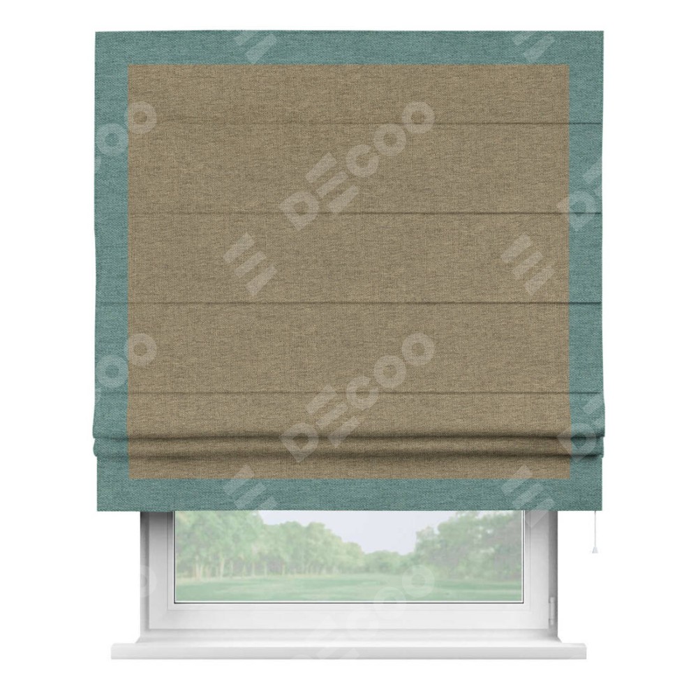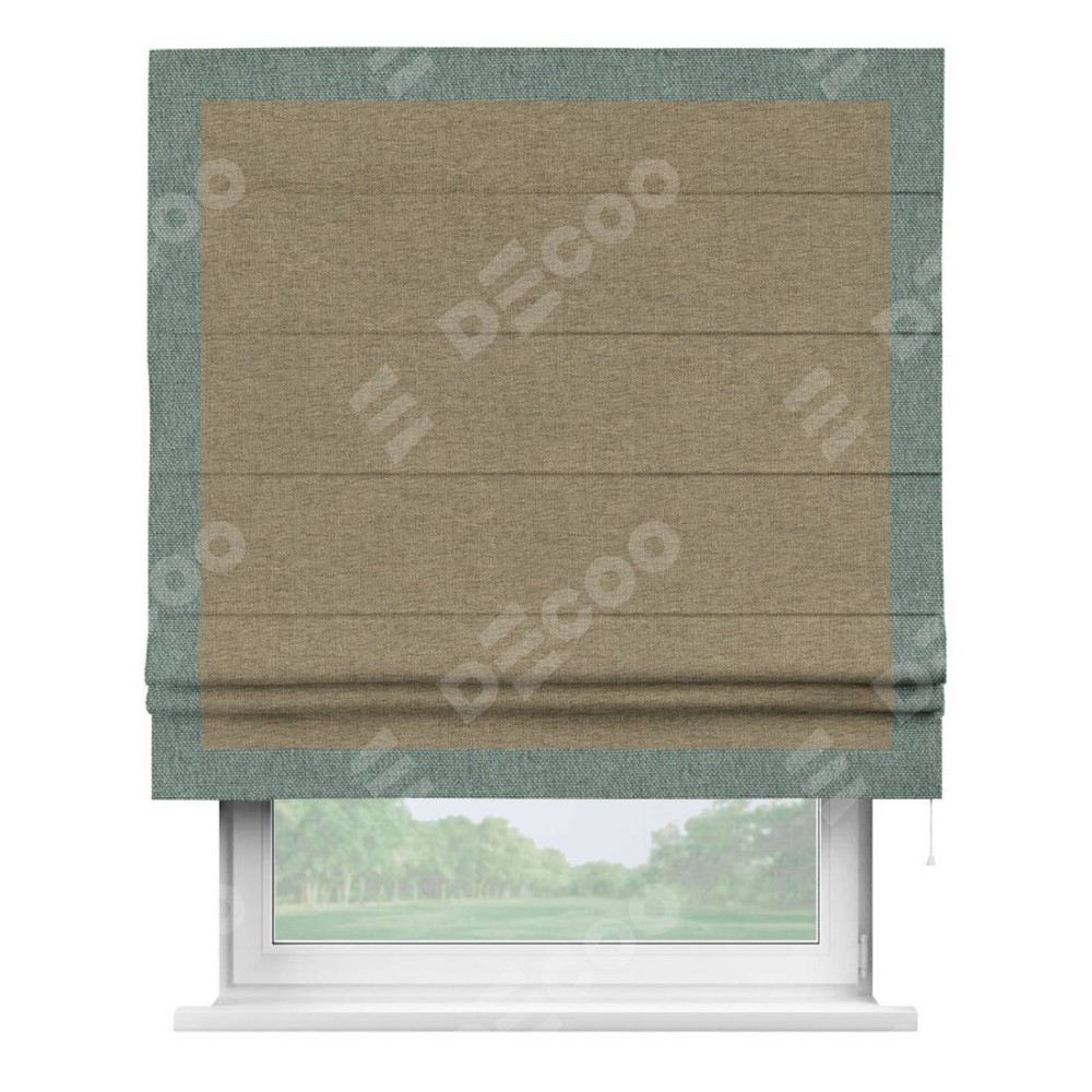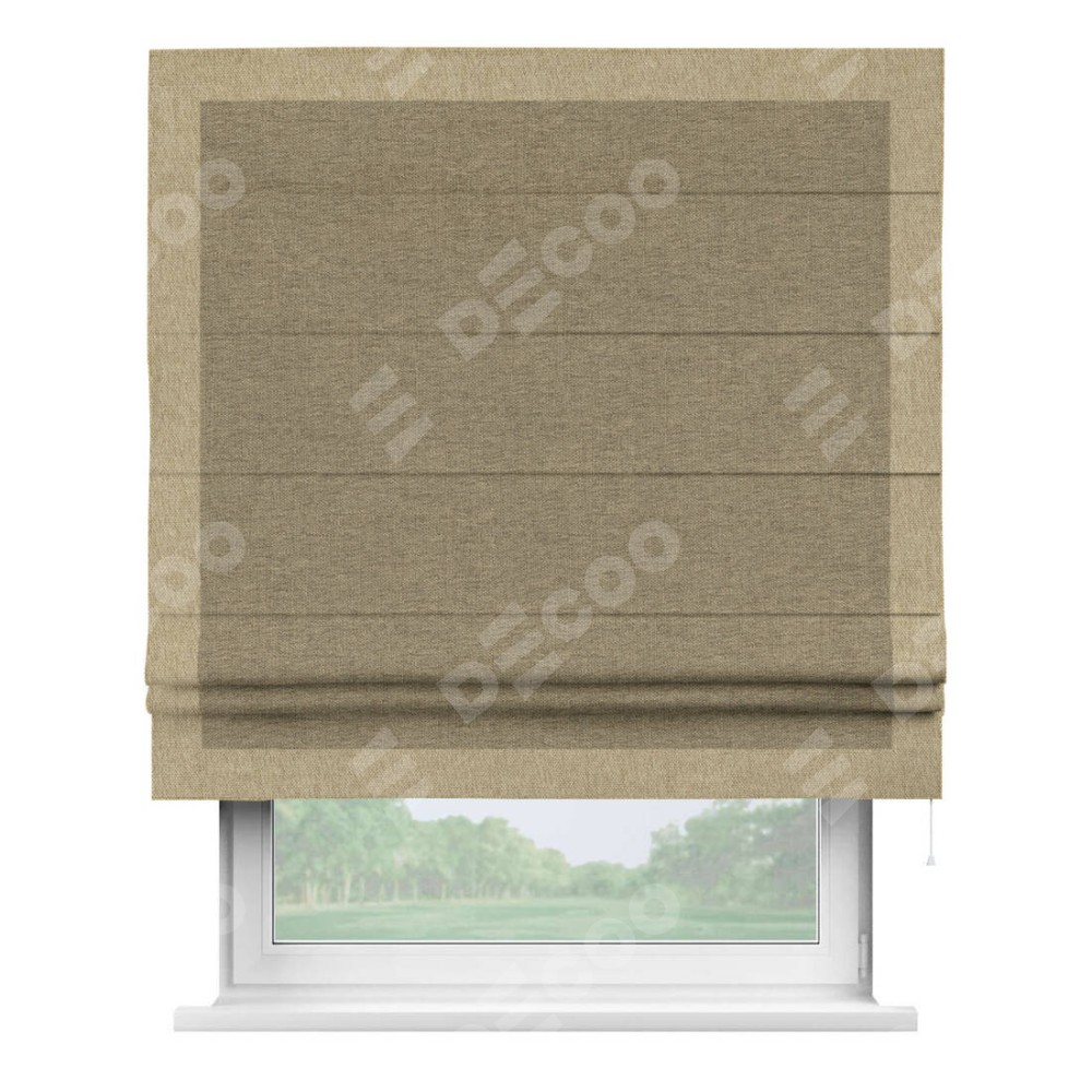 Римская штора производителя «Cortin», используется для проёма, пошита из ткани стиф димаут тёмно-бежевый, артикул 18085. Отделка шторы кантом «Чесс», ткань для канта используется из стифа разной расцветки на выбор. Имеет универсальный механизм и подходит для монтажа: на потолок, на стену и в нишу.