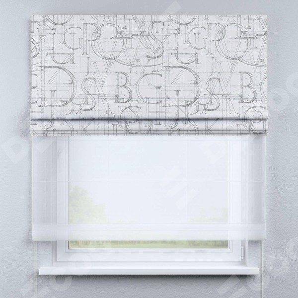 Римская штора день-ночь производителя «Cortin», используется для проёма, пошита из двух полотен, с лицевой блэкаут с нанесением сублимационной печати «Античные буквы», вторая ткань тюль (по стандарту комплектуется тюль белого цвета артикул V-01). Имеет универсальный механизм и подходит для монтажа: на потолок, на стену и в нишу.