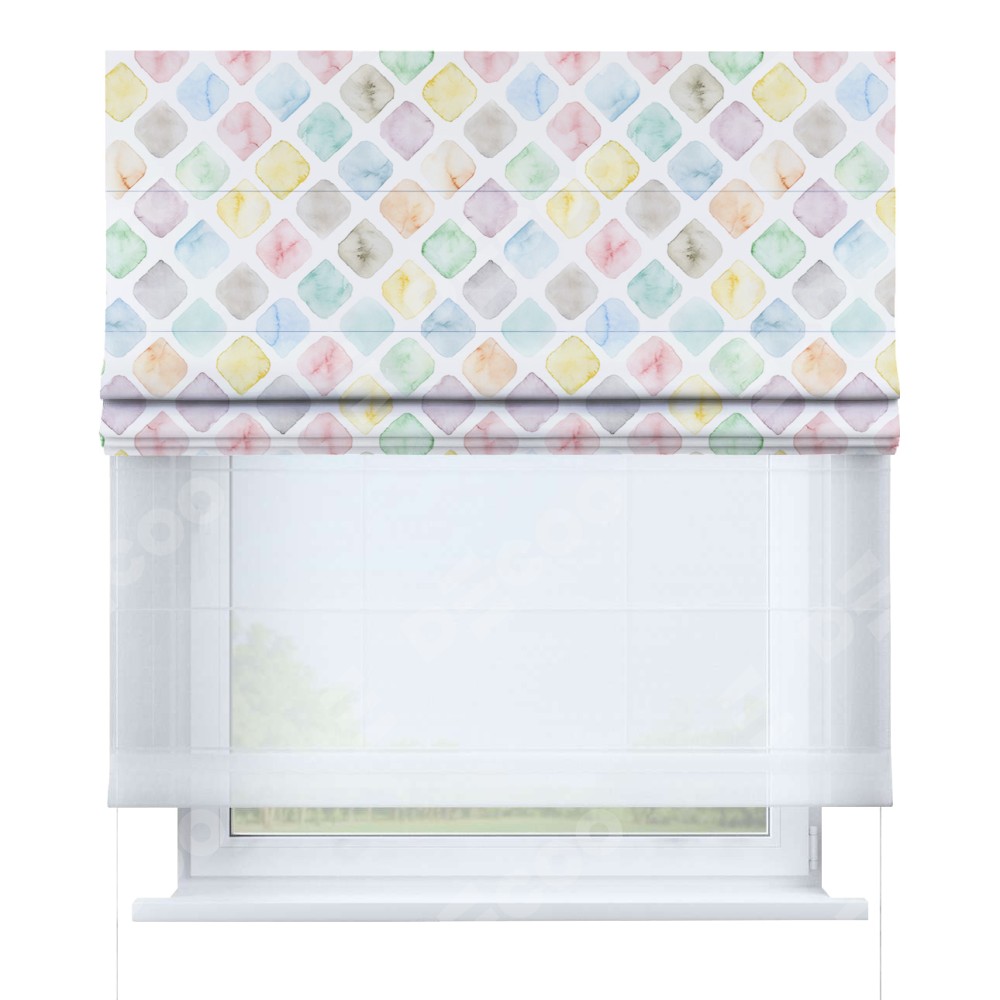 Римская штора день-ночь производителя «Cortin», используется для проёма, пошита из двух полотен, с лицевой блэкаут с нанесением сублимационной печати «Мозаика акварель», вторая ткань тюль (по стандарту комплектуется тюль белого цвета артикул V-01). Имеет универсальный механизм и подходит для монтажа: на потолок, на стену и в нишу.