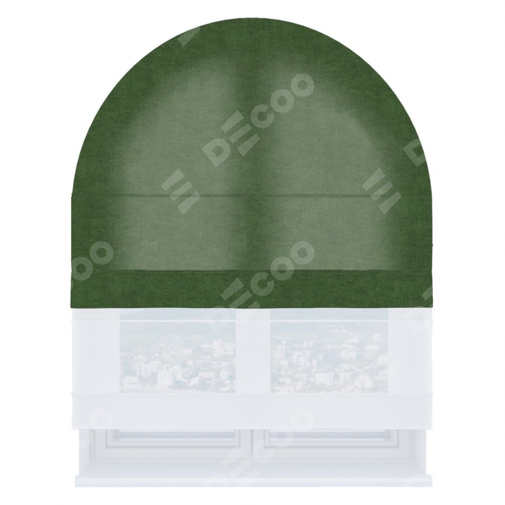 Римская штора день-ночь производителя «Cortin», используется для арочного проёма, пошита из двух полотен, с лицевой стороны канвас зелёный артикул v-16, вторая ткань тюль (по стандарту комплектуется тюль белого цвета артикул V-01). Штора шьётся по индивидуальным размерам, для данного типа римской шторы возможная ширина от 60 до 300 см. Удобное управление каждой шторой отдельно.