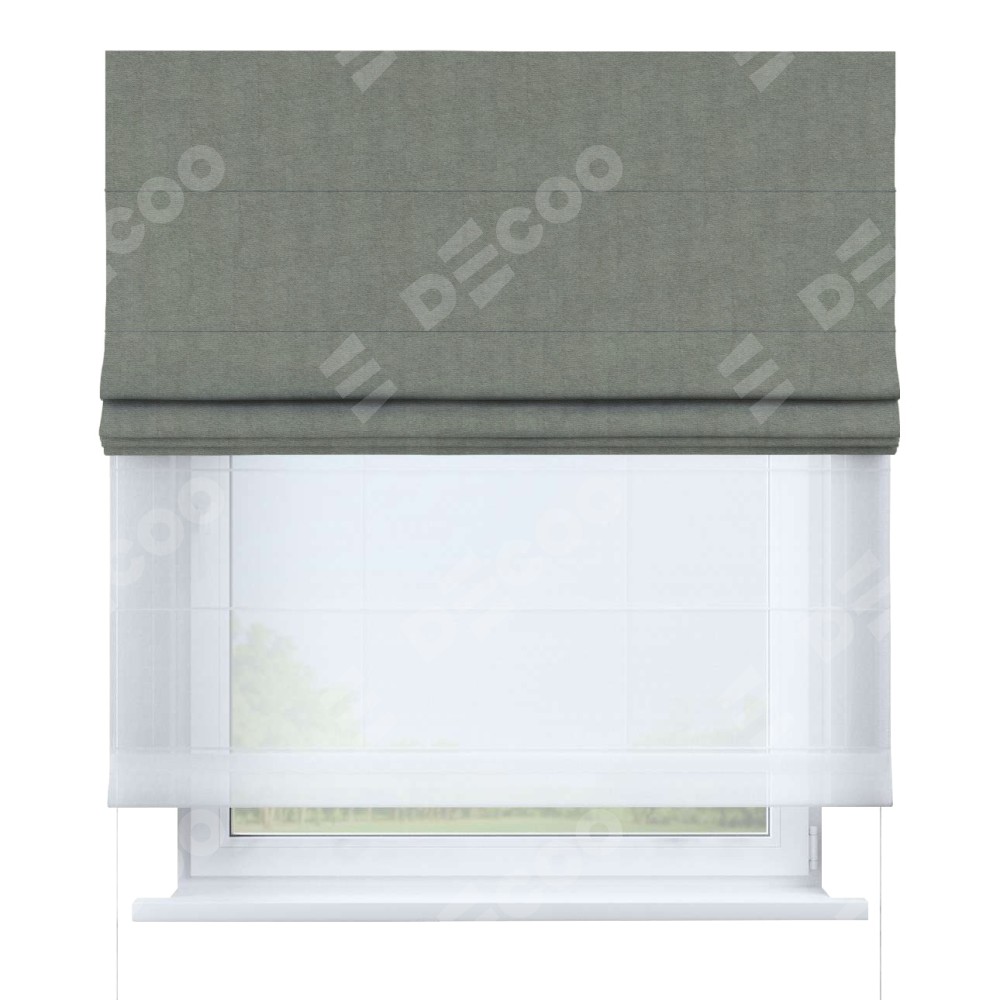 Римская штора день-ночь производителя «Cortin», используется для проёма, пошита из двух полотен, с лицевой стороны канвас сизый артикул v-1902, вторая ткань тюль (по стандарту комплектуется тюль белого цвета артикул V-01). Имеет универсальный механизм и подходит для монтажа: на потолок, на стену и в нишу.