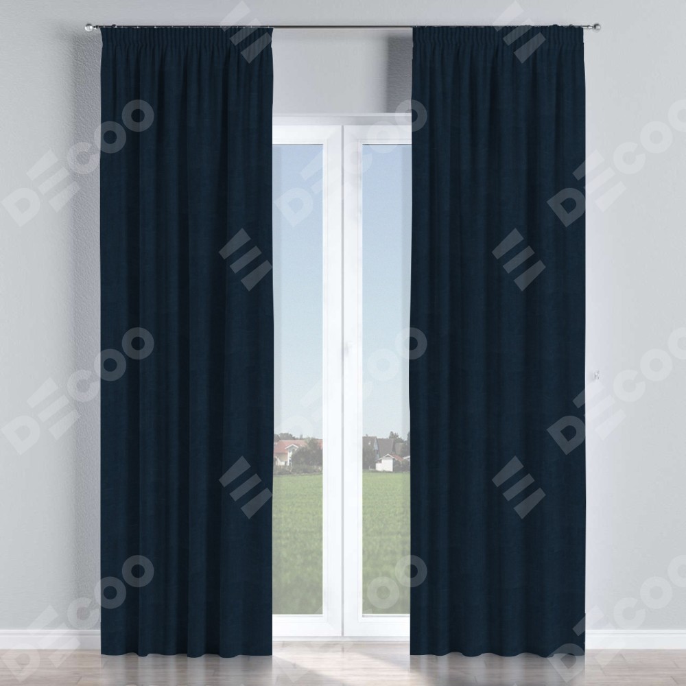 Комплект прямых штор, от производителя «Cortin», пошиты из ткани канвас тёмно-синий, артикул ткани v-206. С изнаночной стороны в верхней части штор пристрачивается шторная лента с декоративными складками «Карандаш». Для создания элегантных складок прямые шторы шьются по стандарту с коэффициентом 1:2 (на 100 см. ширины проёма 200 см. ширины ткани).