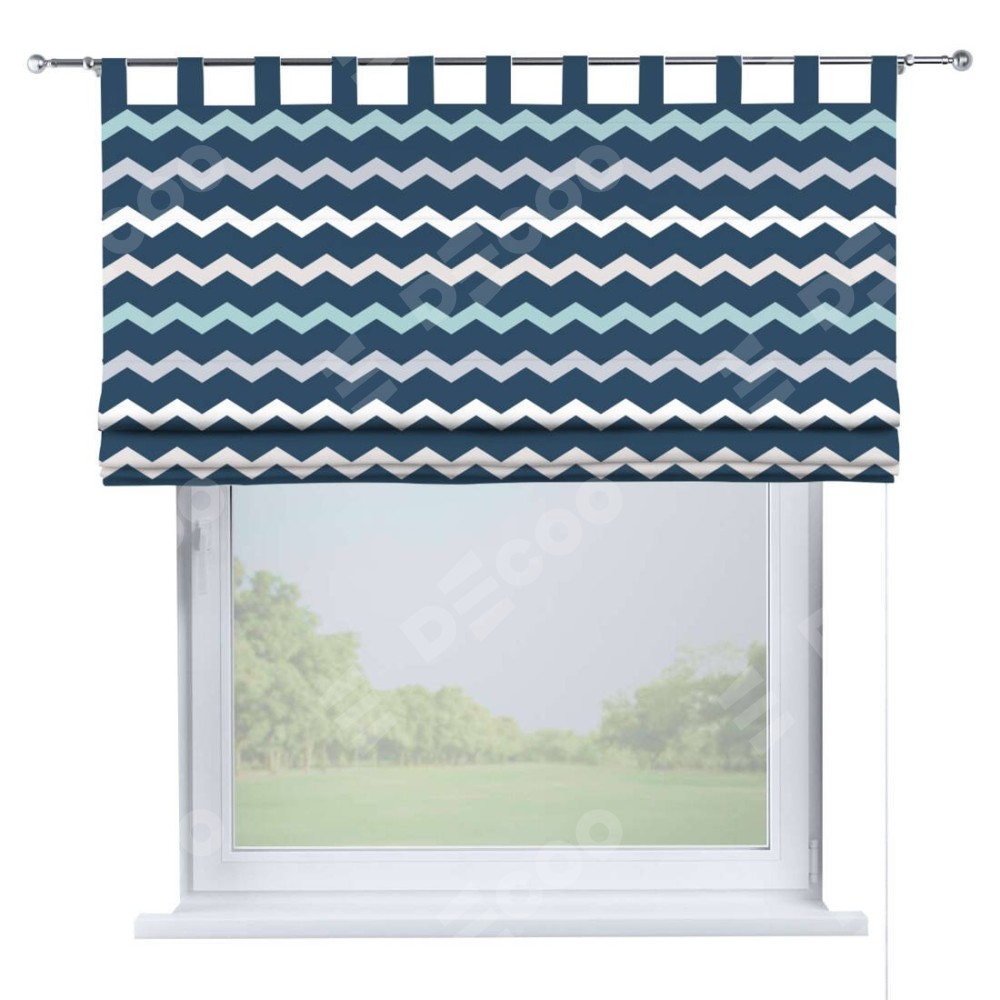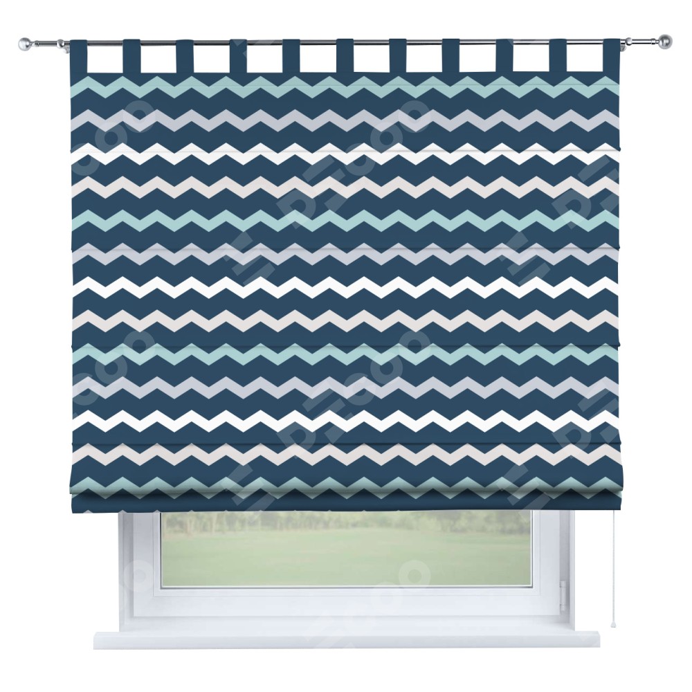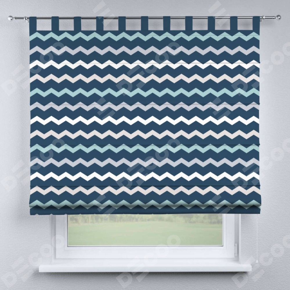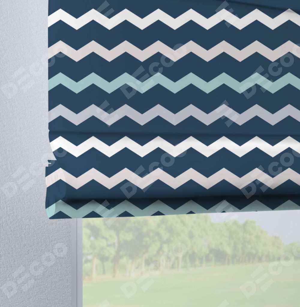 Римская штора производителя «Cortin», используется для проёма, пошита из ткани блэкаут с нанесением сублимационной печати «Морской шеврон». Данная модель пошита на петлях, комплектуется на выбор круглым карнизом и подходит для монтажа на стену. Римская штора на петлях имеет простую систему регулировки высоты, отличительным преимуществом данной модели является простой способ монтажа. Достаточно повесить ее на трубу и штора готова!