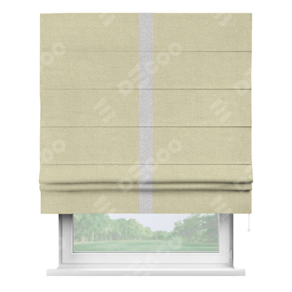 Римская штора производителя «Cortin», используется для проёма, пошита из ткани лён димаут шампань, артикул 90994. Отделка шторы кантом «Хайвэй», ткань для канта используется из льна димаут разной расцветки на выбор. Имеет универсальный механизм и подходит для монтажа: на потолок, на стену и в нишу.