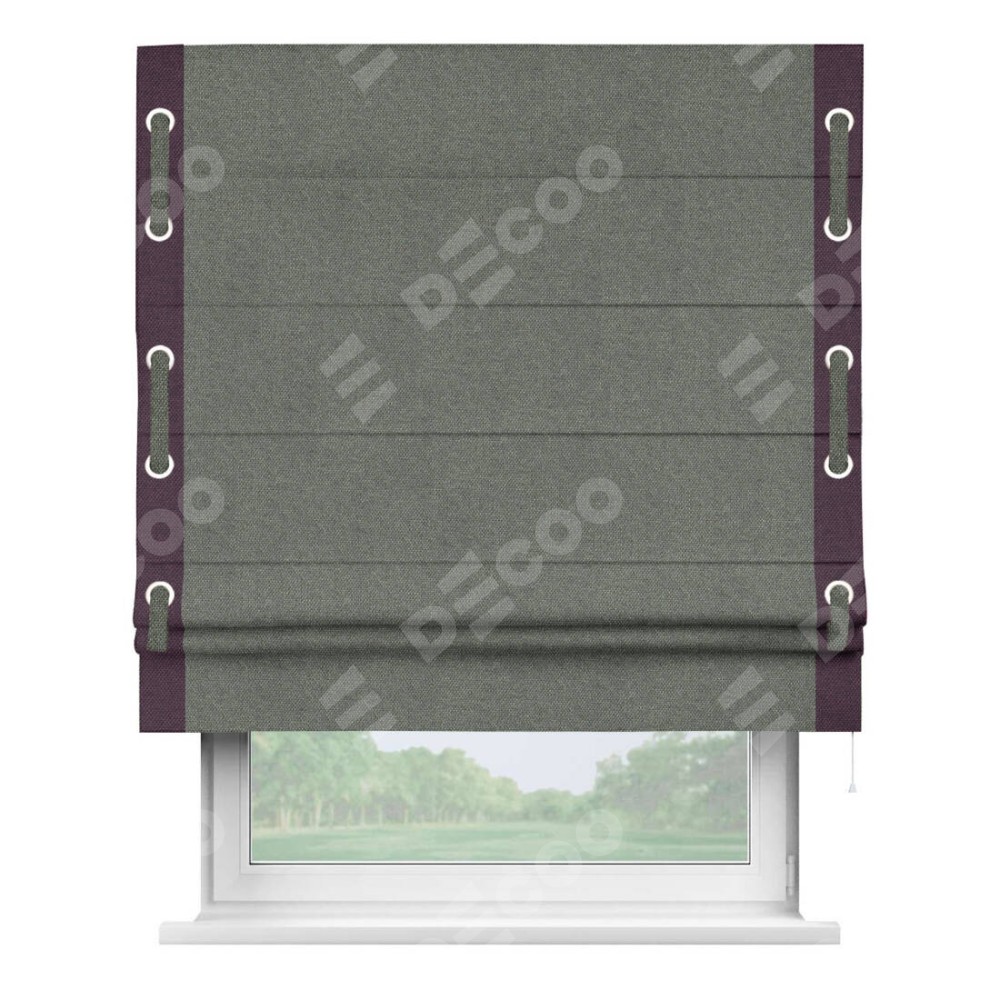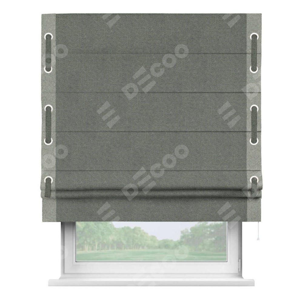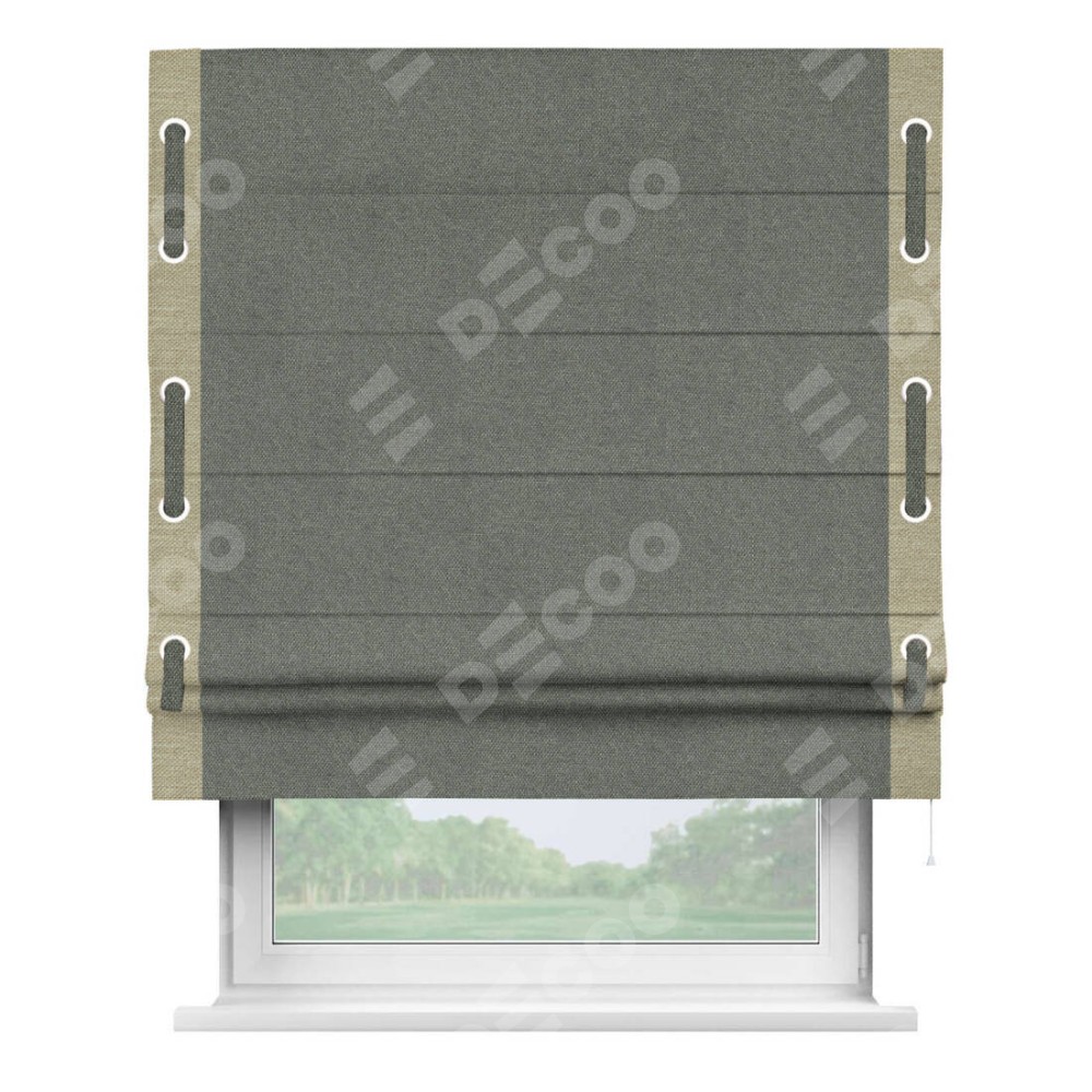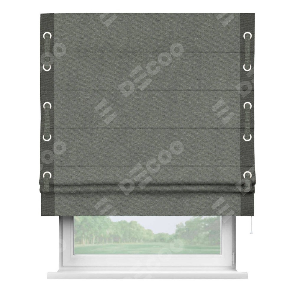 Римская штора производителя «Cortin», используется для проёма, пошита из ткани лён димаут тёмно-серый, артикул 91011. Отделка шторы кантом «Стрим Дуо» на кантах расположены люверсы с пояском, ткань для канта используется лён димаут разной расцветки на выбор. Ткань для пояска обычно используется из основной ткани шторы, а так же можно сделать из любой расцветки по желанию. Имеет универсальный механизм и подходит для монтажа: на потолок, на стену и в нишу.