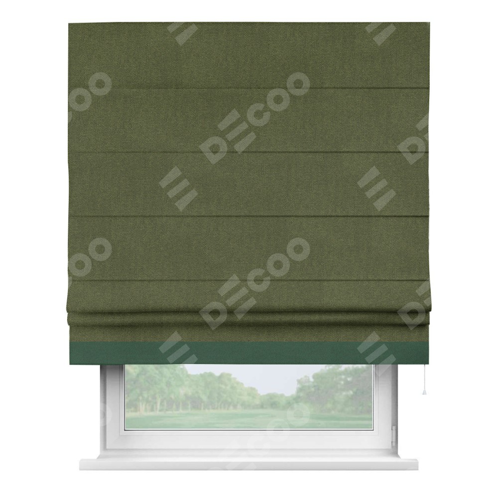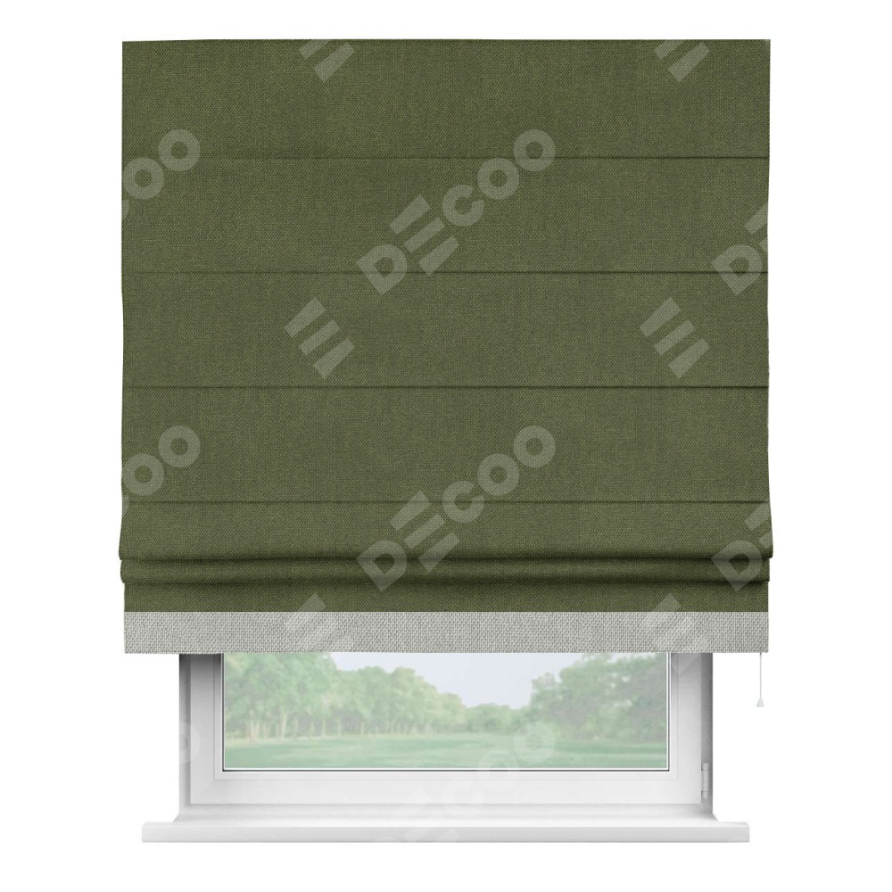Римская штора производителя «Cortin», используется для проёма, пошита из ткани лён димаут салатовый, артикул 91002. Отделка шторы кантом «Джестер», ткань для канта используется из льна димаут разной расцветки на выбор. Имеет универсальный механизм и подходит для монтажа: на потолок, на стену и в нишу.