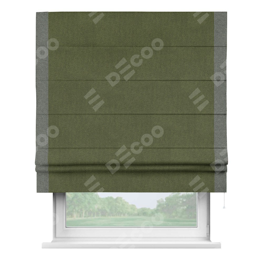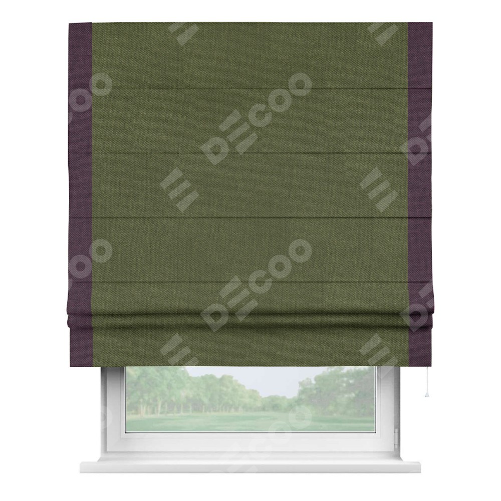 Римская штора производителя «Cortin», используется для проёма, пошита из ткани лён димаут салатовый, артикул 91002. Отделка шторы кантом «Стрим Дуо», ткань для канта используется из льна димаут разной расцветки на выбор. Имеет универсальный механизм и подходит для монтажа: на потолок, на стену и в нишу.