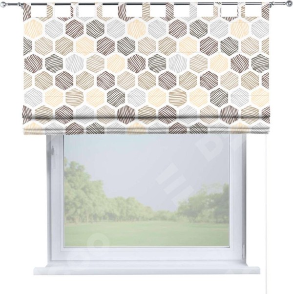 Римская штора производителя «Cortin», используется для проёма, пошита из ткани блэкаут с нанесением сублимационной печати «Мозаика соты». Данная модель пошита на петлях, комплектуется на выбор круглым карнизом и подходит для монтажа на стену. Римская штора на петлях имеет простую систему регулировки высоты, отличительным преимуществом данной модели является простой способ монтажа. Достаточно повесить ее на трубу и штора готова!
