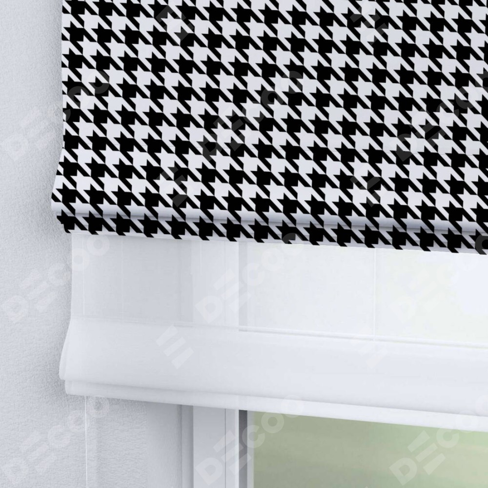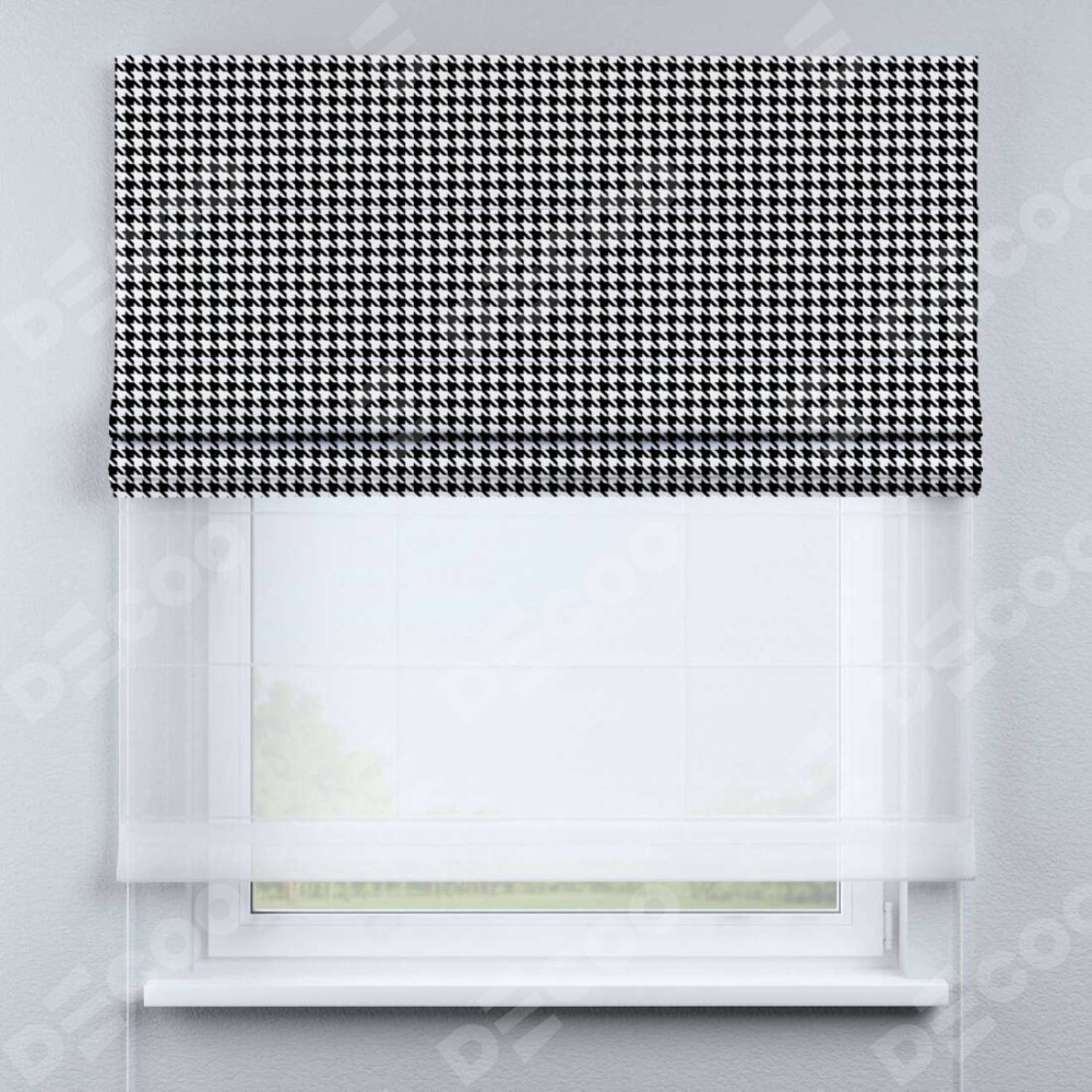 Двойная римская штора «День-ночь» от производителя Cortin предназначена для использования в проёмах. Эта штора уникальна тем, что состоит из двух полотен. На лицевой стороне находится блэкаут с нанесением сублимационной печати «Гусиные лапки» черно-белый», обеспечивающий эффективное затемнение. В комплект также входит вторая ткань — легкий белый тюль (артикул: V-01), который добавляет изящества и легкости оформлению окна. Кроме того, доступны и другие разновидности ткани тюль, выбор которых доступен по ссылке .