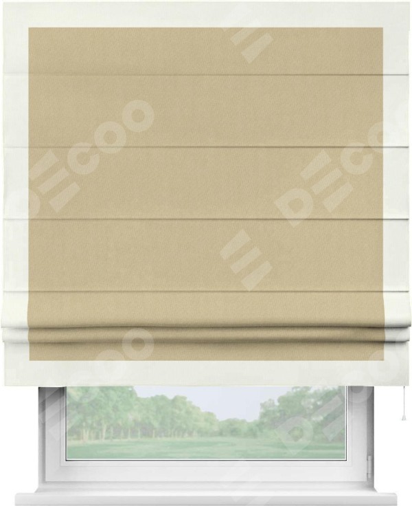 Римская штора производителя «Cortin», используется для проёма, пошита из ткани канвас бежевый, артикул ткани v-96. Отделка шторы кантом «Чесс» (молочный v-93), ткань для канта используется из канваса разной расцветки на выбор. Имеет универсальный механизм и подходит для монтажа: на потолок, на стену и в нишу.