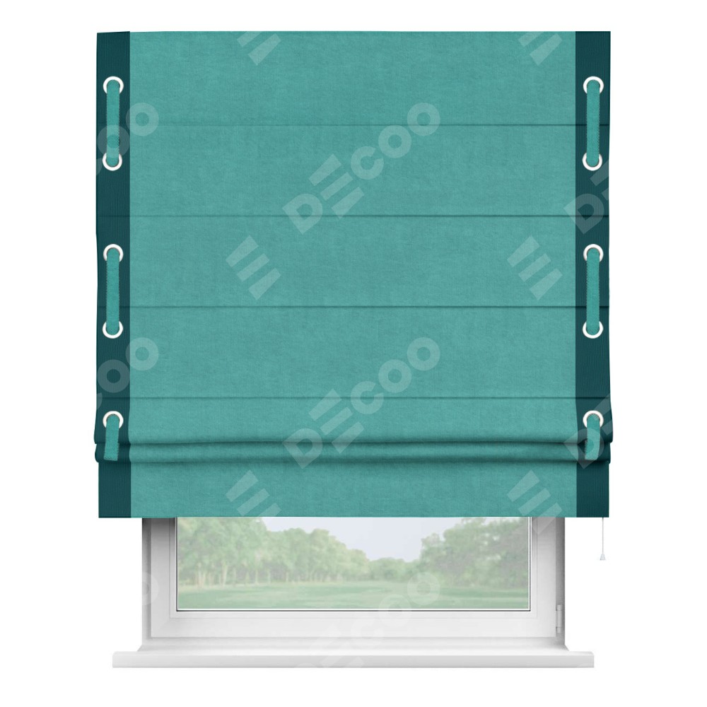 Римская штора производителя «Cortin», используется для проёма, пошита из ткани канвас бирюзовый, артикул ткани v-1048. Отделка шторы кантом «Стрим Дуо» (изумрудный v-12487) на кантах расположены люверсы с пояском, ткань для канта используется из канваса разной расцветки на выбор. Ткань для пояска обычно используется из основной ткани шторы, а так же можно сделать из любой расцветки по желанию. Имеет универсальный механизм и подходит для монтажа: на потолок, на стену и в нишу.