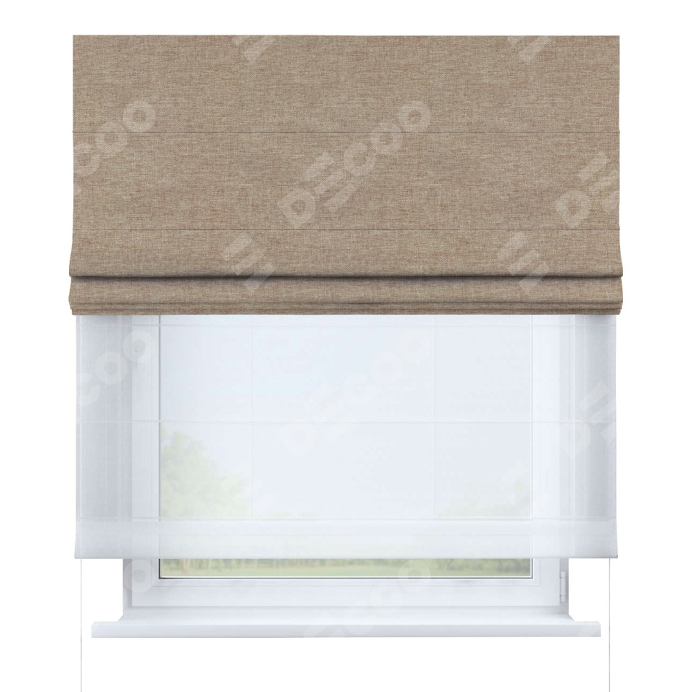 Римская штора день-ночь производителя «Cortin», используется для проёма, пошита из двух полотен, с лицевой стороны лён кашемир коричневый артикул 21614, вторая ткань тюль (по стандарту комплектуется тюль белого цвета артикул V-01). Имеет универсальный механизм и подходит для монтажа: на потолок, на стену и в нишу.