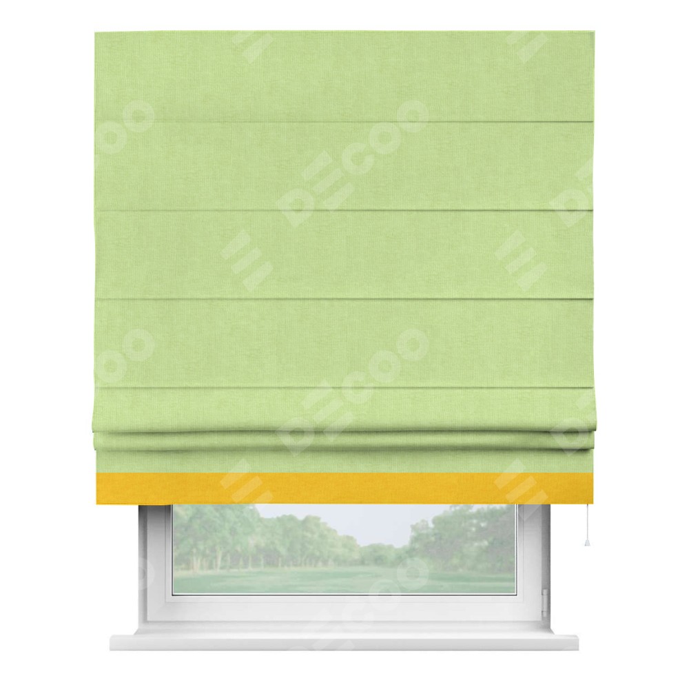 Римская штора производителя «Cortin», используется для проёма, пошита из ткани канвас липовый, артикул ткани v-207. Отделка шторы кантом «Джестер» (желтый v-344), ткань для канта используется из канваса разной расцветки на выбор. Имеет универсальный механизм и подходит для монтажа: на потолок, на стену и в нишу.