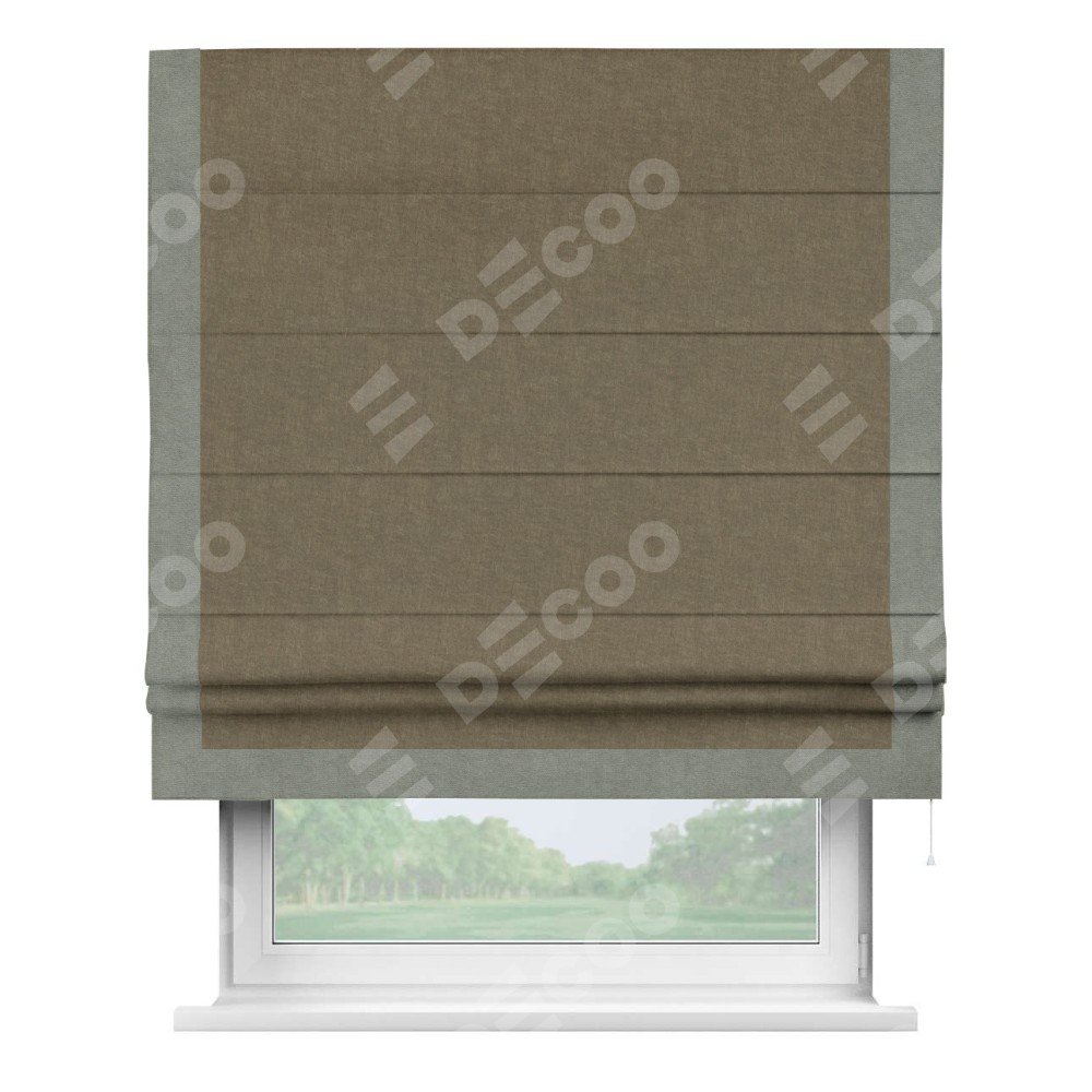 Римская штора производителя «Cortin», используется для проёма, пошита из ткани канвас молочный шоколад, артикул ткани v-08. Отделка шторы кантом «Виктория» (сизый v-1902), ткань для канта используется из канваса разной расцветки на выбор. Имеет универсальный механизм и подходит для монтажа: на потолок, на стену и в нишу.
