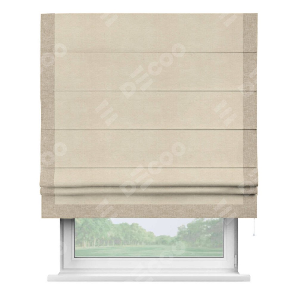 Римская штора производителя «Cortin», используется для проёма, пошита из ткани лён кашемир шампань, артикул 17205. Отделка шторы кантом «Виктория», ткань для канта используется из льна разной расцветки на выбор. Имеет универсальный механизм и подходит для монтажа: на потолок, на стену и в нишу.
