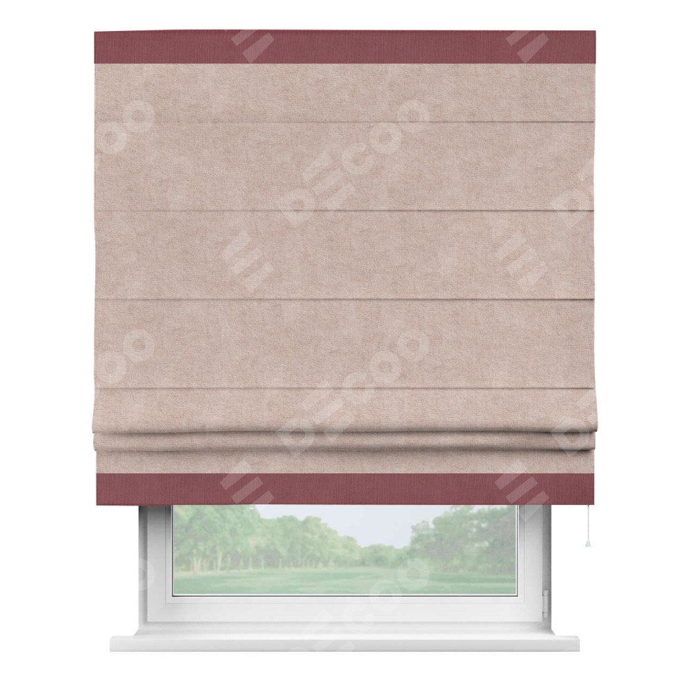 Римская штора производителя «Cortin», используется для проёма, пошита из ткани канвас пудровый, артикул ткани v-35. Отделка шторы кантом «Горизонт» (ягодный v-28), ткань для канта используется из канваса разной расцветки на выбор. Имеет универсальный механизм и подходит для монтажа: на потолок, на стену и в нишу.